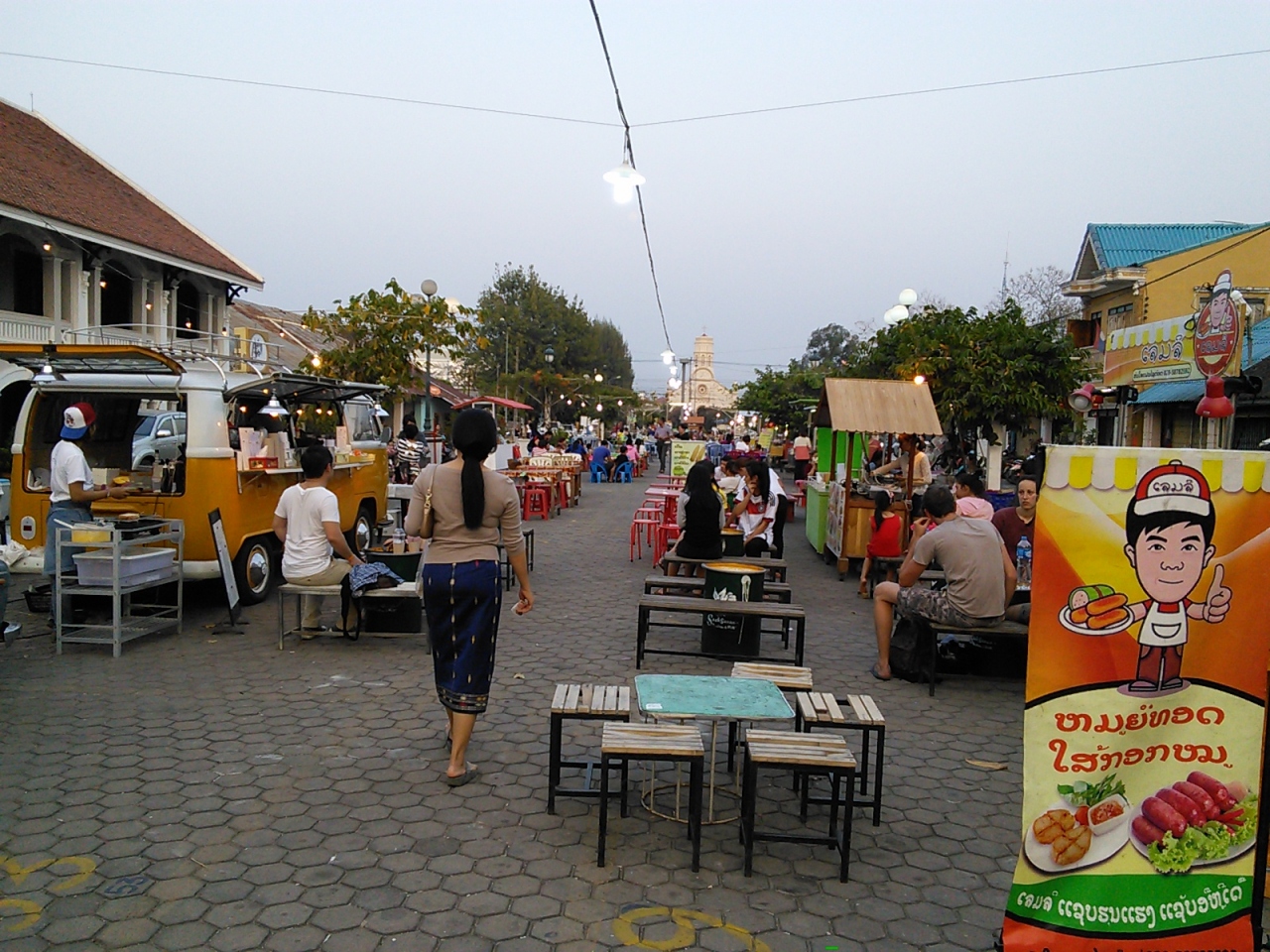サワンナケートのオールドタウン中心、聖テレサ教会の前にある広場は昼間は閑散としていますが夕方からナイトマーケットに変わります。定番の串物や焼き物、麺類、ソムタム、鍋、飲茶、スイーツ、車を改造したちょっとおしゃれなハンバーガー屋などいろいろな種類の店があります。もちろんアルコールもOK。規模はあまり大きくはありませんがその分落ち着いていて雰囲気もいいです。イスとテーブルが用意されているのでその場で食べられます。夜風に吹かれながら気持ちよく食事ができます。