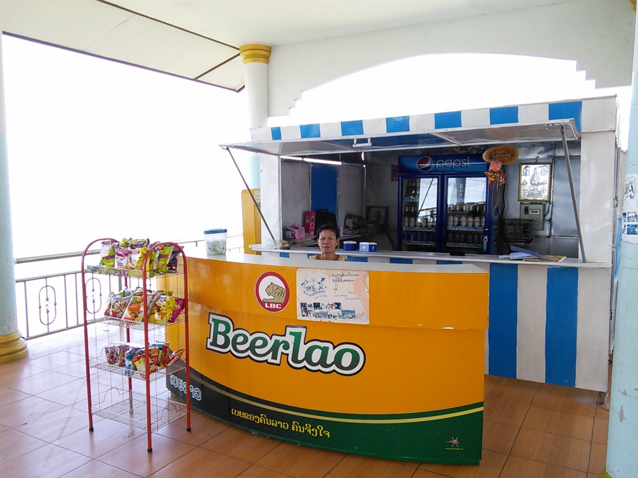 メコン川に突き出した大きな東屋を利用したレストラン。高級そうですがそれほど高くはありません。なんとビラアオ(大びん)は10000kipです。ツーリスト用のレストランやおしゃれなカフェより安く、その辺の屋台や商店と同じ値段です。しかもメコン川の雄大な眺めが付いているわけですからこれをお得と言わず何と言えるでしょう。空芯菜炒めやオムレツなど簡単なものなら15000kip、フライドライス、フライドヌードルなどは20000kip、その他25000kip~でいろいろなメニューがあります。ぜひメコン川越しに夕日が沈む時間に出かけて下さい。最高の眺めが待っています。