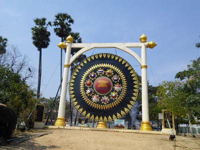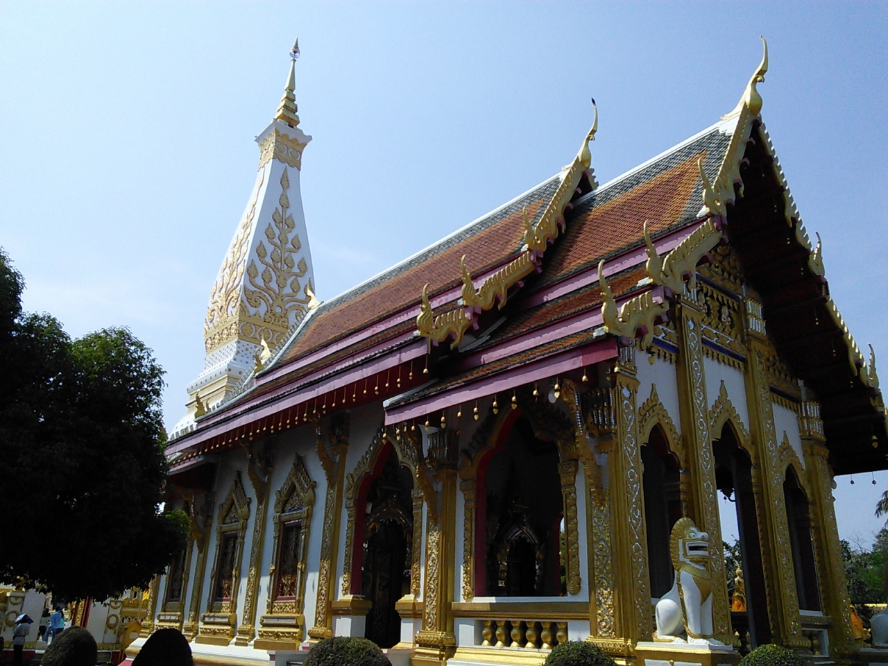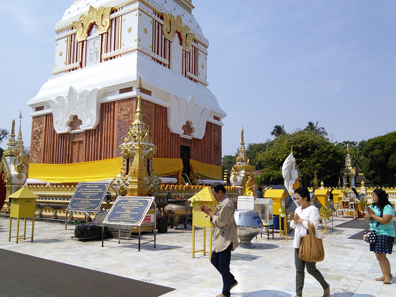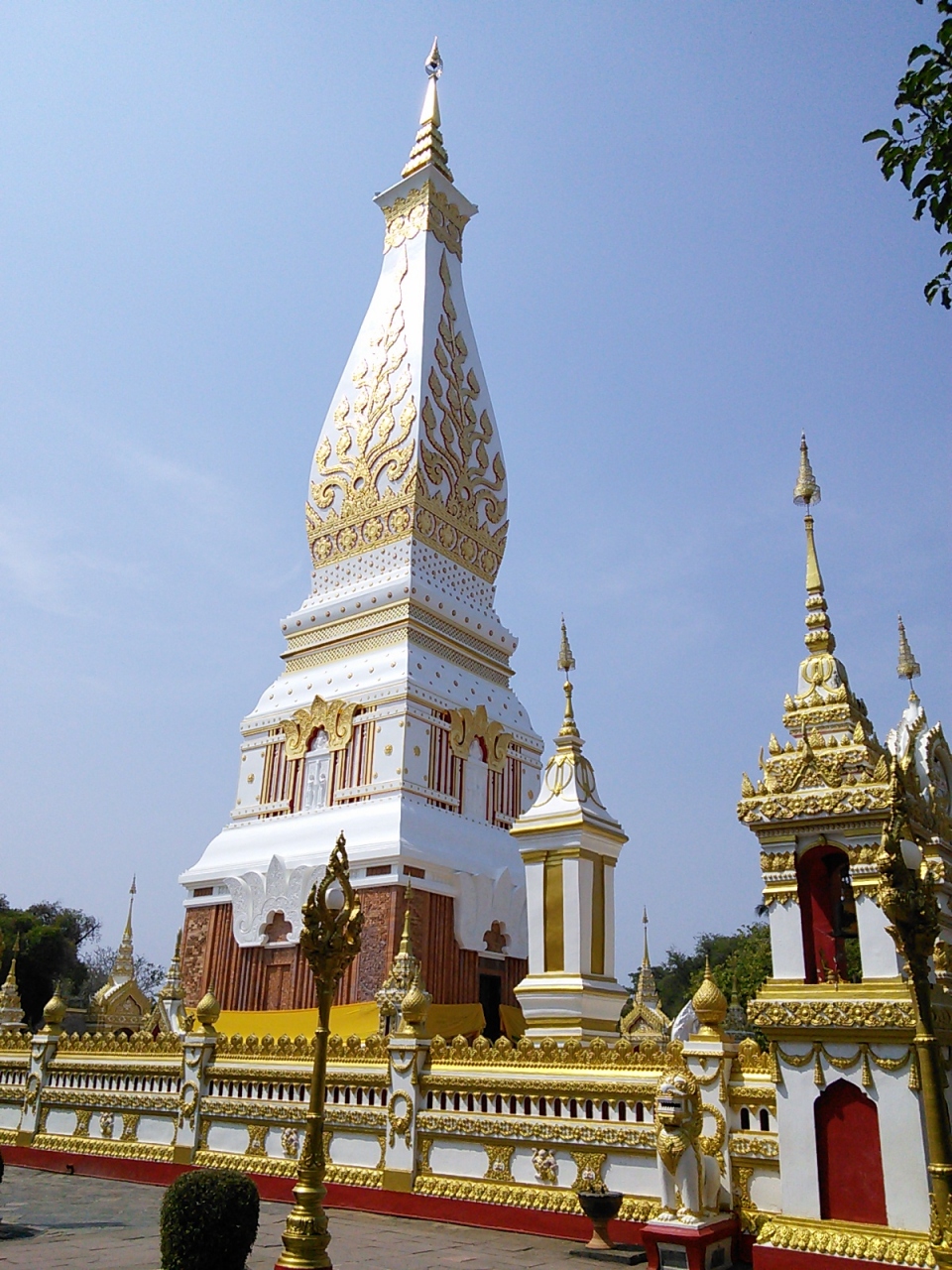 白を基調とした高さ53.6mのストゥーパは美しいだけではなく気品すら感じられます。この地方にはラオス様式のストゥーパが数多くありますが大きさ、美しさ、参拝客の多さは他を圧倒しています。ナコーンパノム、ムクダハンからはロットゥー(乗り合いワゴン)でいずれも1時間ほど40Bなので日帰りも十分可能です。わざわざ見に行く価値は十分にあると思います。広い敷地内にはこれまた巨大な銅鑼が吊るされています。これも必見です。