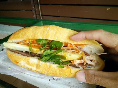 店名は「メーブアム」。看板に英語表記はなくラオス語で書かれています。メインストリートLatsavongseuk Rdのカフェ チャイディーの向かい辺りです。ここのサンドイッチは他の店と比べても具沢山でボリュームがありとてもおいしいです。具材は屋外のガラスケースではなくちゃんと冷蔵ボックスに入っていて、バケットも炭火で炙ってあるのでパリパリです。サンドイッチ屋は朝のみの営業の所が多いですがこの店は17:00頃までやっています。スタンダードなカオ チー パテは7000kip。他にはスクランブルエッグや、チーズ、ミルク入りなどもあります。写真のメニューを参照して下さい。とても人気店のようで朝やお昼時などは客がひっきりなしにやって来ます。