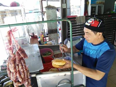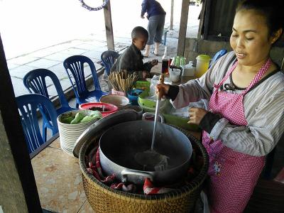 場所はPhetsalat Rd、旧スタジアム近くのフットサルコートなどがある「Cultural Thamuang Village」という公園の向かいです。店名の書かれた看板はありません。カオ ピアック センの入った大鍋が目印です。- 旅行時期