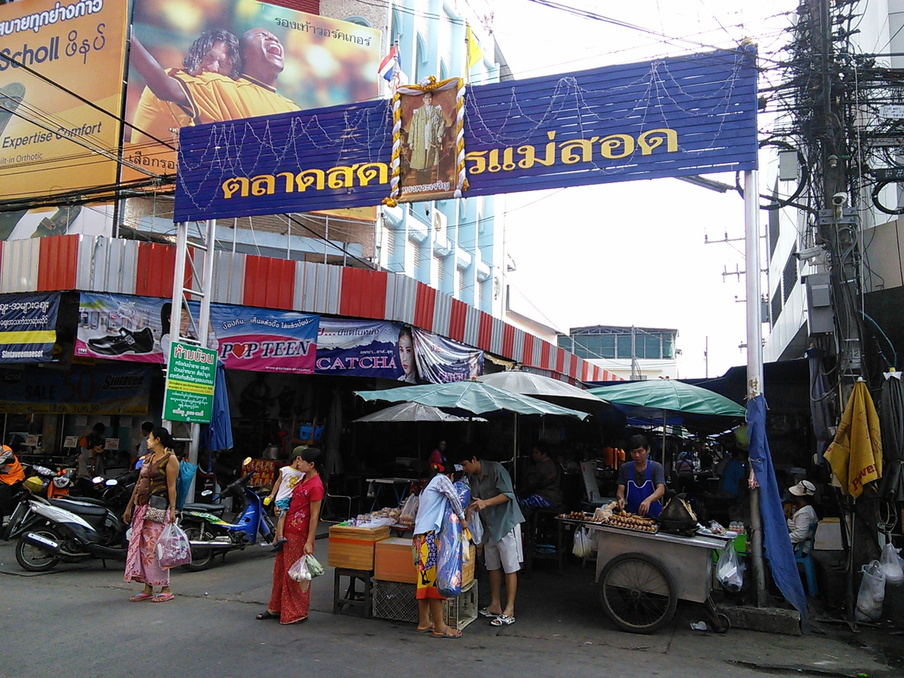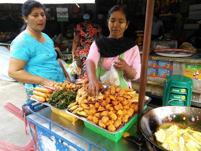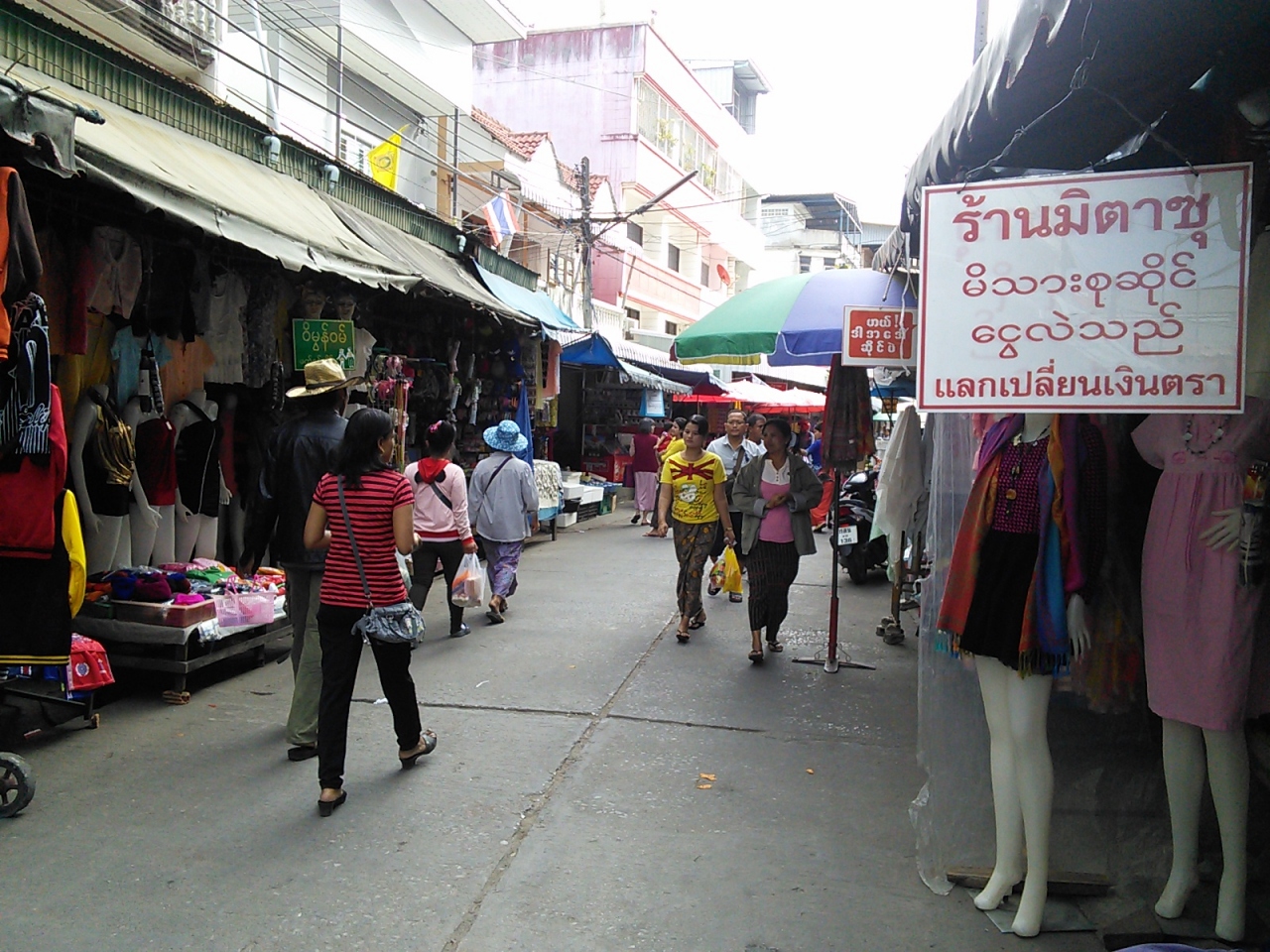 メーソート市街中心、Chumphon Kiri Rdにある路上市場。通り沿いには魚や野菜、果物の生鮮品からお総菜、衣類、日用品などの店が並んでいます。しかしここはミャンマー国境に近いメーソート、他の町の市場とは一味違います。あちこちにビルマ文字が溢れミャンマー人も多く聞きなれない言葉が飛び交っています。タナカやロンジー、ミャンマースターのカレンダーなども売られています。サモサなどのスナック類もありタイにいながらミャンマーの雰囲気を味わうことができます。