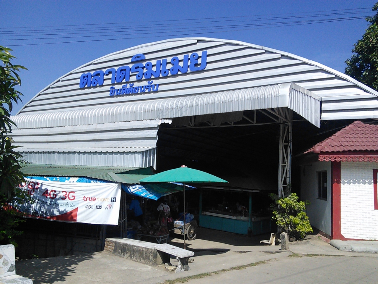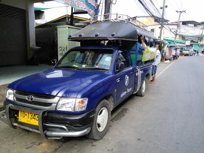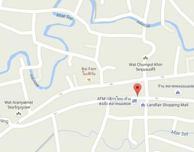 タイ・ミャンマー友好橋(国境)行きのソンテウ乗り場はプラサート・ウィーティー通りのメーソート市場(ミャンマー市場)の入口やや西側にあります(写真の地図を参照)。紺色のソンテウが停まっているので声をかけてみて下さい。所要約15分、20B。