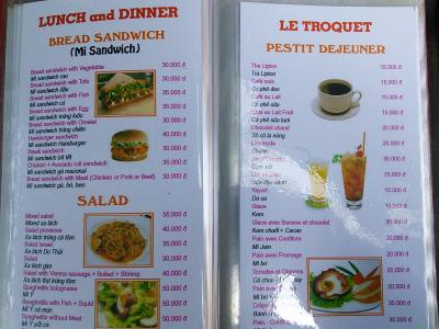 メニューはフランスパンのサンドイッチ3万ドン~、フォー2.5万ドン~、フライドライス3万ドン~、ソフトドリンク1.5万ドン~、ビール(330ml缶)1.5万ドン~などがあります。- 旅行時期