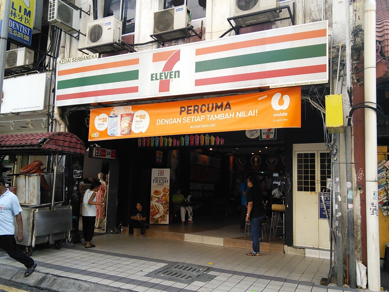 クアラルンプールではセブンイレブンはよく見かけます。が、価格はかなり高めです。例えばチャイナタウンのスルタン通りにある店舗ではコカコーラ500mlペットボトル:2.65RM、マギーホットカップ(カップラーメンです):2.55RMに対しすぐ近くのMydin内のスーパーではまったく同じ商品がそれぞれ1.85RM、1.65RMとかなり違います。24H営業という便利さはありますが価格面をみたら利用価値はありません。しかしなぜか菓子パンや食パンは同じ価格です(どこのスーパー、商店も同じ価格)。なのでいつも食パンだけ買わさせてもらっています。