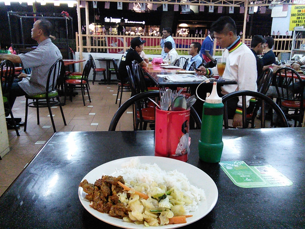 夜8:00頃行ってみました。フードコートと呼ぶには寂しすぎる~。おかずのバットが並んだインド料理とロティチャナイ、ミーバクソの店だけでした。1番まともそうなインド料理屋でビーフカレーと野菜をご飯に盛ってもらいました。これで7RM。まあ妥当な値段だと思います。というかブキッビンタンにしたらお値打ちな方かもしれません。場所はチャンカット ブキッビンタン通りのバーが立ち並ぶエリアから少し外れたちょうど人通りがなくなる辺りで旅行者の姿もなく、店内も空いており落ち着いて食事ができます。