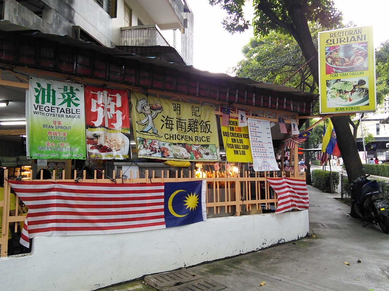 ブキッビンタンにある大屋台街。やはり夜の方が賑やかですが昼間でもちゃんとレストランや屋台は出ています。昼間は安価な店が多く営業は夕方までで夜には別の屋台に代わるところが多いようです。ブキッビンタンを訪れたついでにアロー通りで昼食を食べてみました。とある店でチキンライスをオーダー。5.2RMと安く味はおいしかったですが鶏肉の量はいまいち、まあブキッビンタン仕様でしょうか。人混みが苦手な人は昼間にどうぞ。
