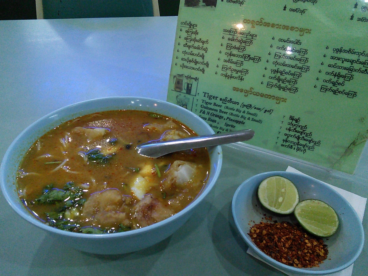 チャイナタウンのKota Rayaショッピングセンターの北側辺り、Jalan Tun Tan Siew SinとLeboh Puduの交差点付近はミャンマー、ネパール、バングラデシュなどの出稼ぎ労働者が集まるエリア。それぞれの国のレストランや商店があります。そんな中の店の1つです。内部はもう完全にミャンマー、ミャンマー文字が踊っています、店員も客もミャンマー人らしき人々。やや薄暗く昼間からビールを飲んでいる人もいたりとちょっと怪しい雰囲気です。メニューはありましたがすべてミャンマー語で理解不能。バットに入ったおかずも並んでいましたが唯一知っているミャンマー料理モヒンガーをオーダー。モヒンガーとはナマズを煮込んだスープの米粉麺。国民食のような存在です。さてお味は…、アツアツでないのが残念でしたがあっさりとしてやさしい味でした。スパイスの効いたマレー、インド料理に疲れた胃袋にはもってこいです。パクチーのアクセントもよかったです。ですが麺の量が少なくこれで6RMはちょっと高いかなと思いました。