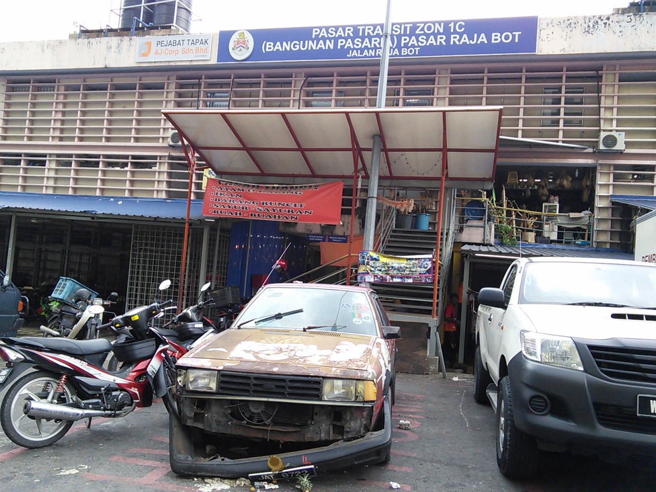 チョウキット駅南側一体で「Pasar Raja Bot」と看板を掲げた市場は2ヶ所、ひとつはJalan Raja AlangのThe Regency Hotelの向かいにある青屋根の市場。こちらはちゃんとしていて面白味はいまいち。もうひとつは歩道橋近くにあるその名もずばりJalan Raja Botの奥にある市場です。通りを抜けた少し開けたことろの右手にあります。まずド肝を抜かれるのが市場の真ん前に放置された朽ち果てた車。なんともいえない場末感が漂っています。内部1階は肉、魚、果物の生鮮品と乾物売り場で結構まともですが2階は漢方薬の材料や怪しい骨董品の類い。裏チョウキットの雰囲気を堪能できます。