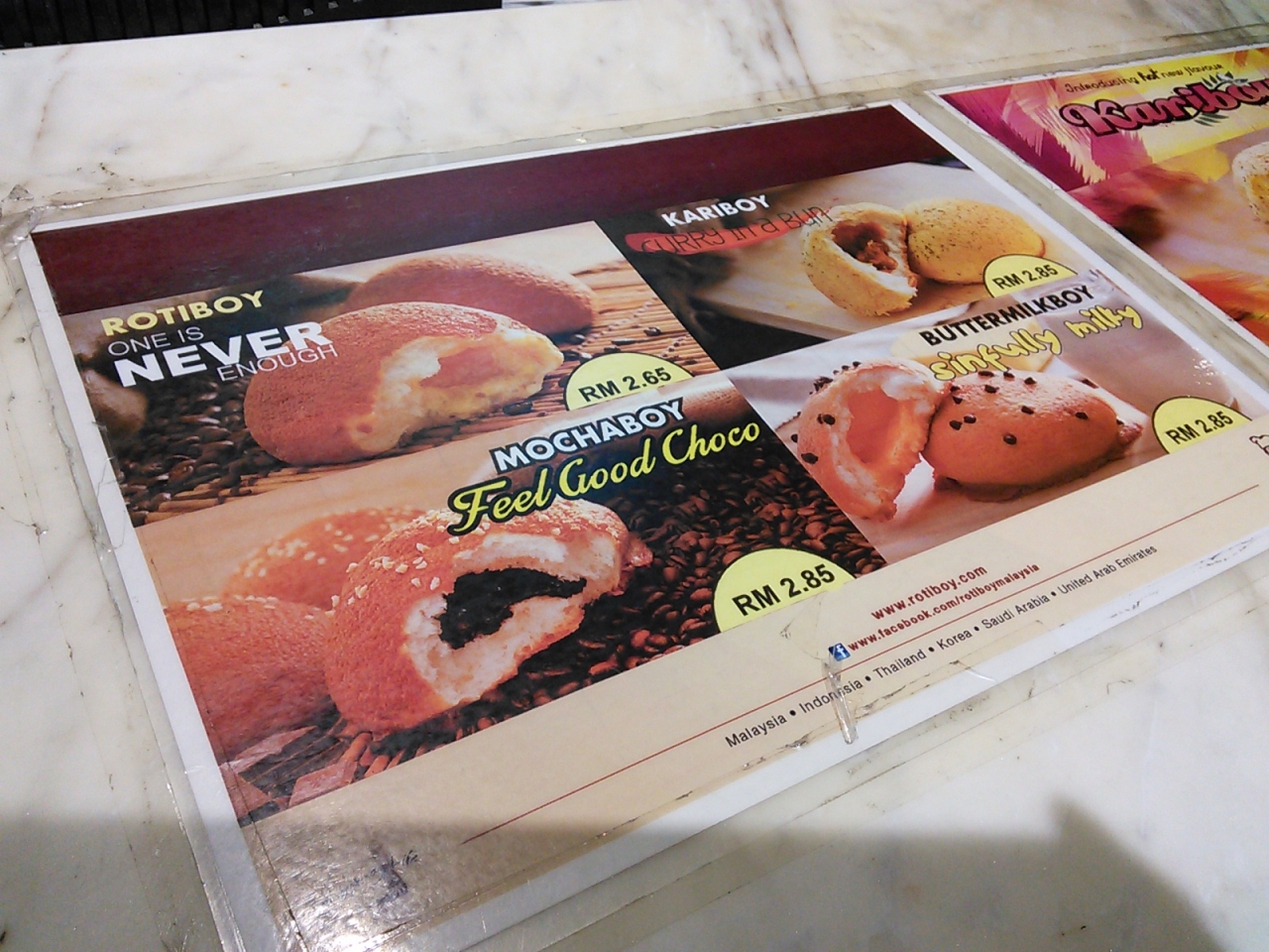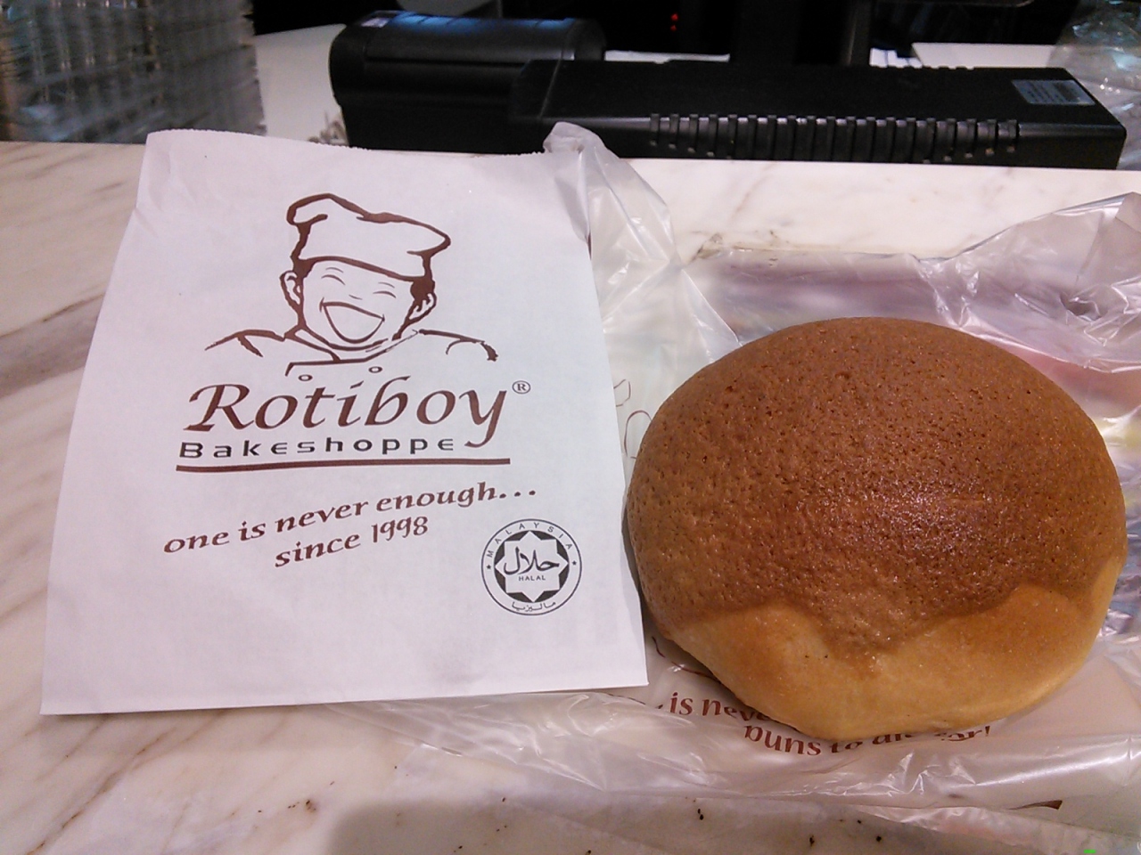 Rotiboyは東南アジアを中心に展開しているパン屋のフランチャイズ店。お店は見かけたことはあり以前から気になっていたので食べに行ってみました。パン屋ですからいろいろな種類のパンがありますがもちろん食べたのは店の名前にもなっている看板商品の「Rotiboy」(1個2.65RM)。よく出るためかすでに紙袋に入れられレジの奥に並べられています。飲食スペースはないのでレジ横でさっそく取り出すと…で、でかい。メニューの写真の印象よりかなり大きいです。そしてがぶり。う~ん、外側の生地はサクサクで歯応えがよく中にはバターのようなマーガリンのようなものが入っています。パンに染み込んでいていい味です。でハチミツのような甘さも…。店の人に尋ねるとハチミツは入っていないと言う。これが秘密の味なんでしょうか。とにかくかなりおいしいです。スリアKLCC以外にもお店はあると思うので見かけたらぜひ食べてみて下さい。