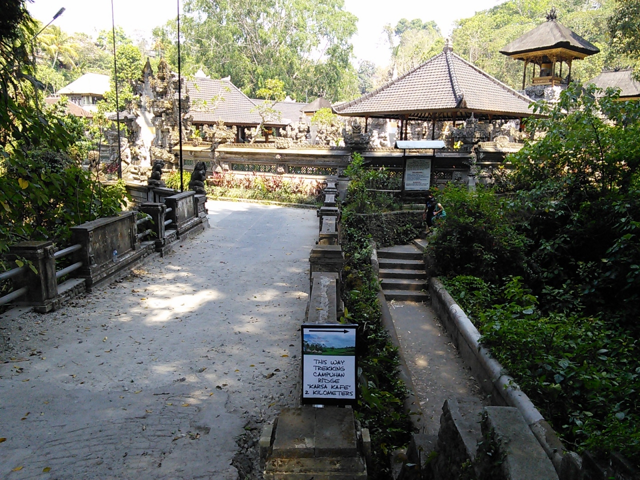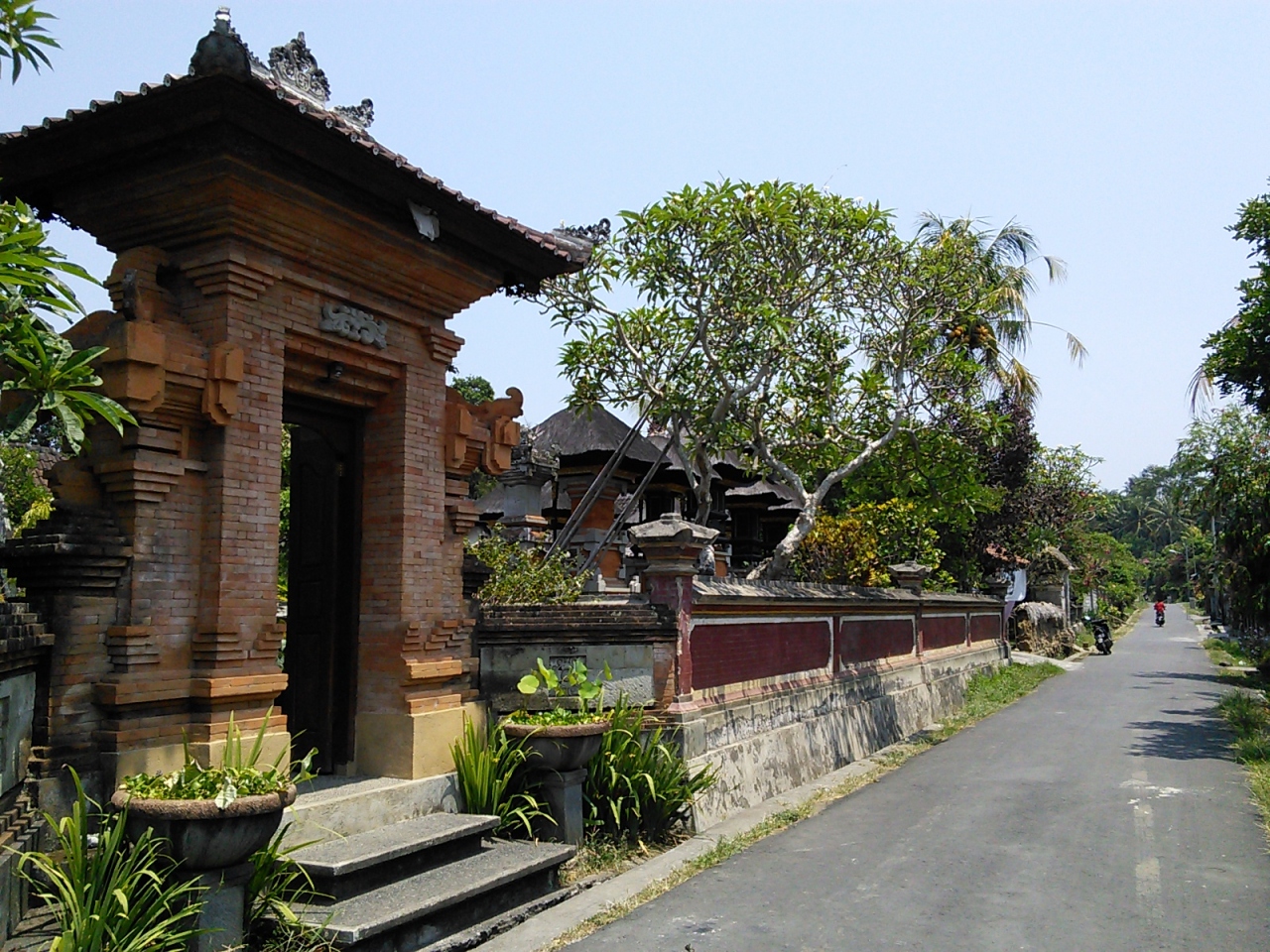 本格的なスタート地点はウブド王宮前からラヤウブド通りを西に500mほど進んだ「IBAH」(Luxualy Villa & Spa)の看板のある道、ここを右に入ります。すぐ先の二股を左へ(右へ行くとIBAH)。坂を下るとグヌン ルバ寺院が見え手前に橋があります。右下の小さな橋を渡ります。5分ほど歩くと小高い丘の上に出ます。両側が谷で視界が開けていて眺めは抜群、吹く風も心地よく気持ちのいい場所です。この尾根道を進み、終わったところがバンキアンシダム村(ここまで所要20分)。絵画やペイントされた木彫りの卵を売るショップなどがあります。道は広い石畳の道になりカフェやホテルが点在しています。やがて左手に田園が見えてきますが残念ながら稲刈りが済んだ後、美しい一面緑の風景はみられませんでした。やがて舗装された道に変わりちょうど稲刈りをしている人達に出会いました。そしてスバリ村到着(ゆっくり歩いて所要1時間くらい)。と言っても村の看板があるわけでもなく道があるだけ。民家が並んでいるのは道の右側に少し入ったところです。私はタブレットのマップを見てわかりましたが周辺の人に聞いた方がいいかも。村には特に何があるというわけではありません。寺院はありましたが短パン姿だったので見学は自粛。しかしどの家も大きなバリの伝統家屋でとても美しい村でした。まさに時が止まったようにのんびりした感じでした。
