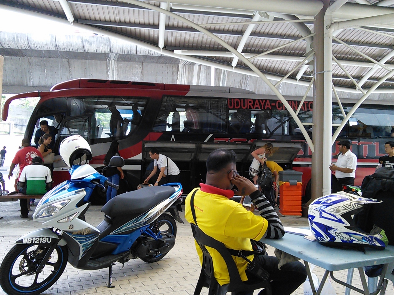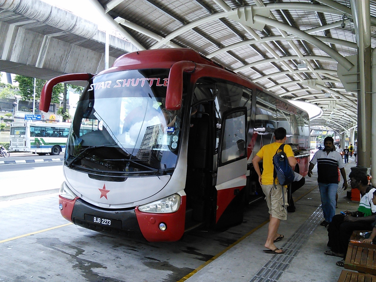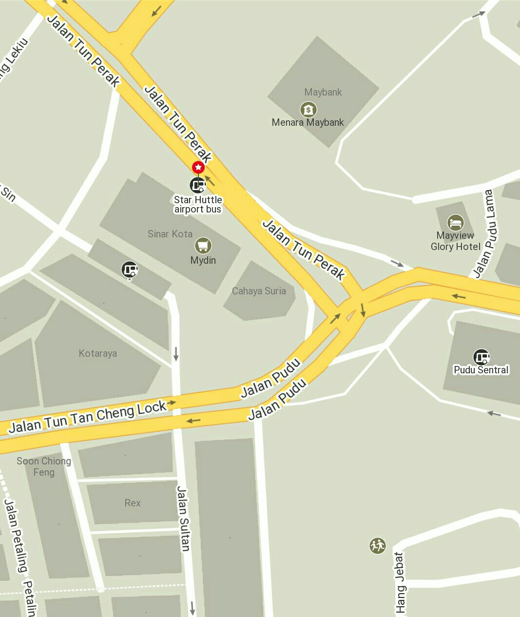 Kota Rayaショッピングセンターの裏手にある「Mydin」の裏側にあるバス停(Puduraya)から「Star Shuttle」のエアポートバスに乗れます。場所は写真の地図参照。舗道にはイスとテーブルのみの簡易チケット販売所があり黄色の制服を着たスタッフが常駐するしています。