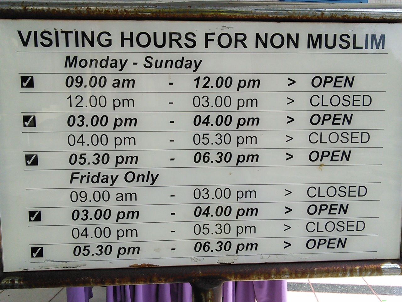 見学者専用の入口にはしっかりとインフォメーションカウンターがあり非モスリムの旅行者でも心配ありません。もちろん肌の露出の多い服装では入場不可ですがそれ用の衣装を無料で貸し出しています。見学は無料。後でドネーションを求められることもありません。それどころかデーツ(ナツメヤシの実)と水の無料サービスもありました。インフォメーションの人はとても気さくで気持ちのよい対応を受けます。毎日見学できますが礼拝の時間はクローズとなります。詳しくは写真の表を参照して下さい。
