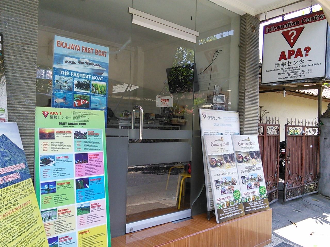 日本語が超堪能なワヤンさんが経営過するインフォメーションセンター。もちろん観光パンフもあり、日本語でいろいろな質問に答えてくれます。各種ツアーも主宰していますが日本語ガイドが含まれているせいか料金はやや高め。しかし他の得体の知れないツアー会社よりは安心できると思います。オフィス内には彼の子供が2人もおり面倒を見ながら業務中、さながら幼稚園のようでした。