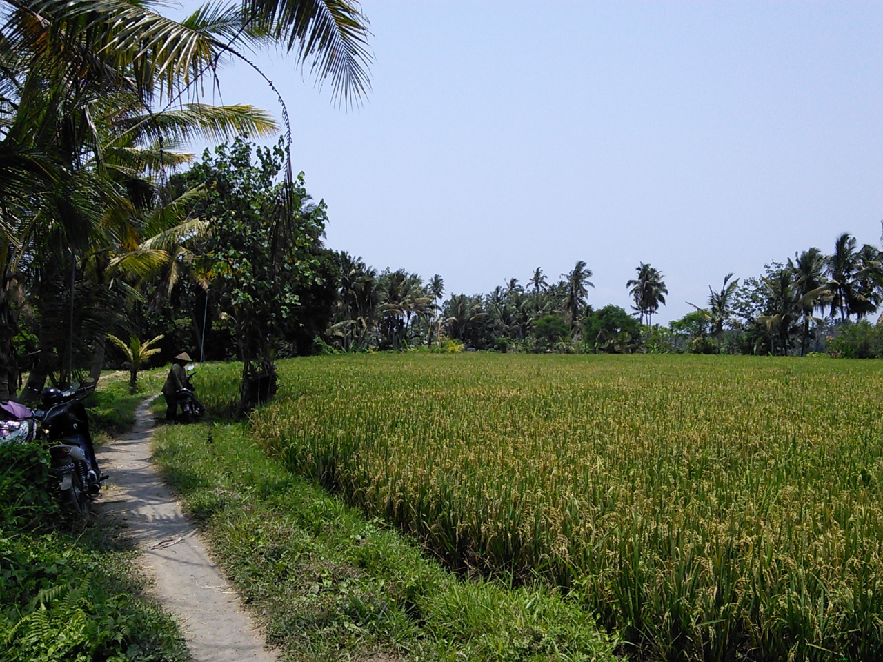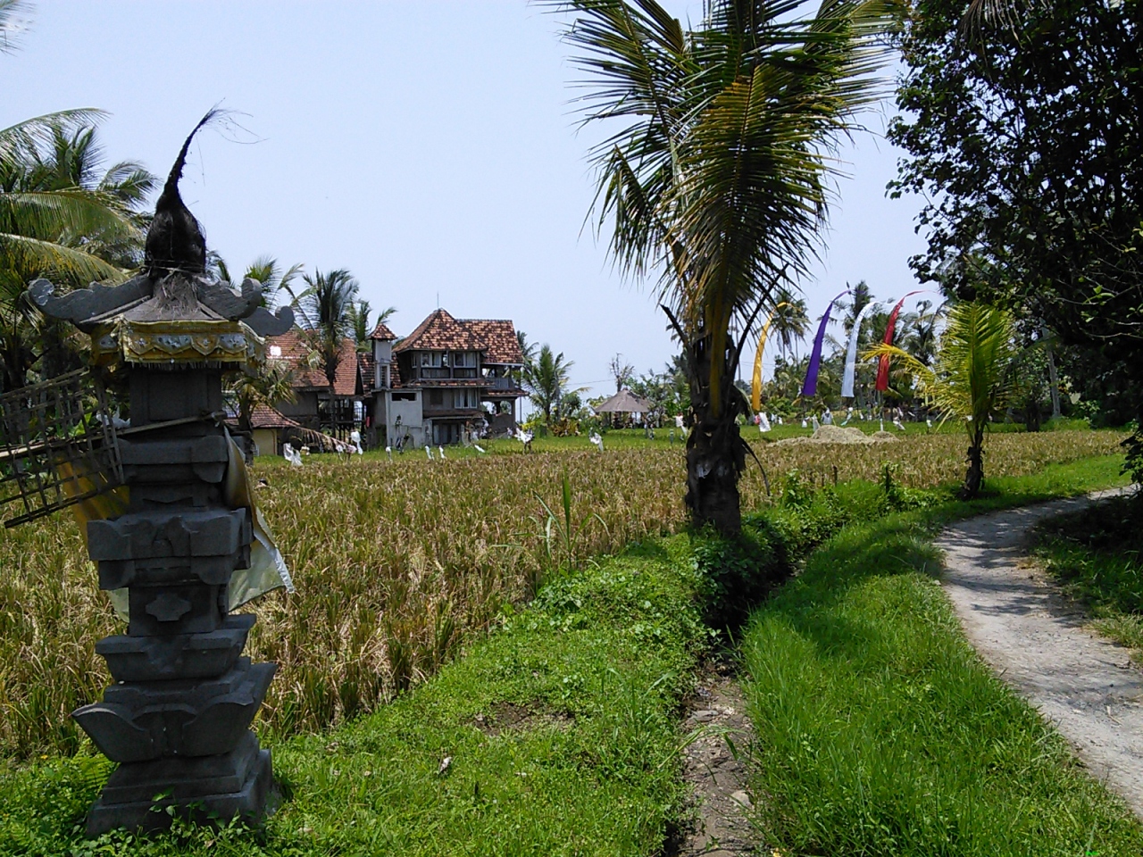 ウブド王宮近くのラヤウブド通りから始まるカジェン通りからスタートしました。住民や旅行者による手作りの石畳ののどかな道を行きます。周りに木が増えて急な坂を登りきるとそこには美しい田園風景が広がっています(ここまでで所要15分)。道なりに右方向へ進むとすぐに何やら看板があり小路が左に別れています。この小路を進んでもいい感じ風景を眺められますがこちらはお手軽コース(私は途中まで行きました)。時間のない方やあまり歩きたくないかたはこの小路を行けば戻れます。本来のコースは直進します。白い新しいホテルの前を過ぎると道は舗装がなくなりどんどん狭くなります。やがて右側に用水路が表れ左側は谷で崖っぷちに…、ここが一番危険な場所なので注意して歩いて下さい。そしてジャングルの中を進むと小さな橋が表れます。ここが折り返し地点(ここまでで所要35分)。橋を渡り左方向へ谷沿いの道を戻ります。50mほど進む右上方向に分かれ道があるのでそれを登ります(矢印あり)。すると茶店があります。茶店を過ぎてすぐの所にを右折すると谷底の川へ下りられますが、水も汚く景色もよくありませんのであまりおすすめはしません。右折せずに真っ直ぐ進めばあとは道なり、危ない場所や迷うようなところもありません。のんびりと美しい田園をゆっくりと眺められます。だんだんとカフェやレストラン、土産物屋が増えてくるので立ち寄りながら一息つくのもいいと思います。やがてラヤウブド通りに戻れます。合計所要時間は1時間15分ほど、個人差は考慮して下さい。