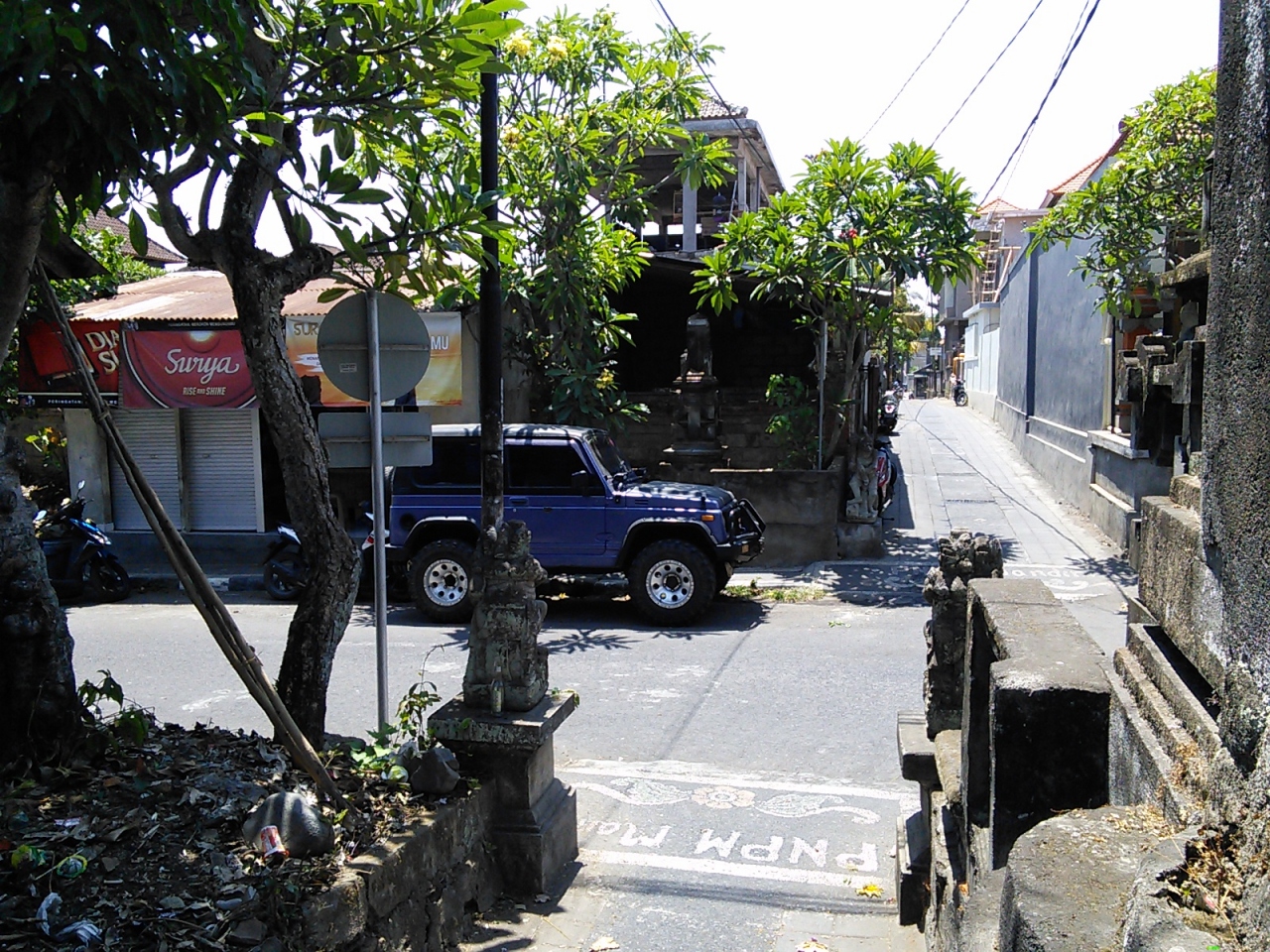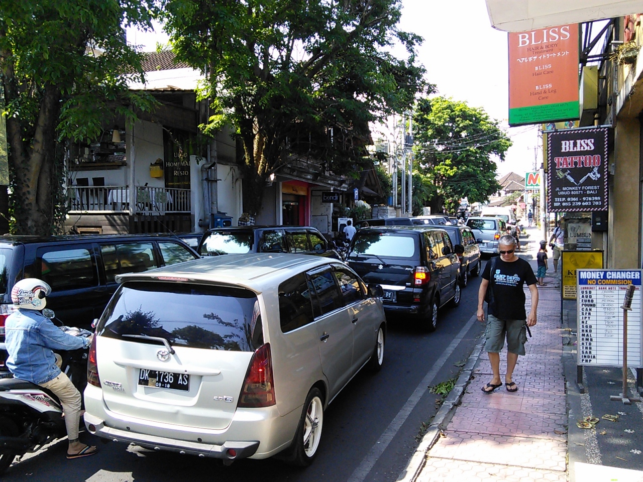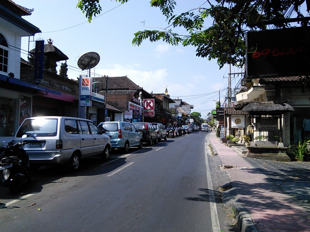 モンキーフォレストとウブド王宮を結ぶメインストリートの1つです。1kmほどの通りの両側にはカフェやレストラン、ホテル、ツアーオフィス、土産物屋、コンビニ、両替所などが隙間なく並んでいます。対面2車線の道路なのですが片側を駐車場代わりにしており王宮へ向かう一方通行となっています。王宮に近づくほど渋滞になり長い車の列ができています。ウブドの古い町並ではもはや車のキャパオーバーであることがよくわかります。