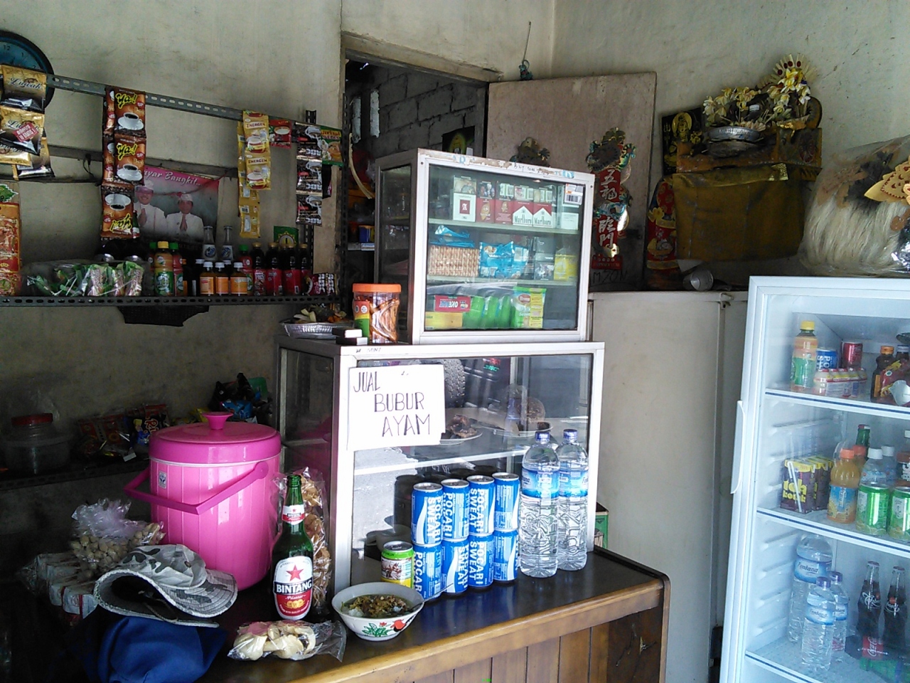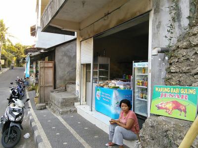 BUBUL AYAM(ブブルアヤム)が食べられる店。といっても食堂ではなく商店の一画で提供しています。場所はJl.Sugriwa沿い、Jl. HanomanとJl. Jembawanに通り抜けする路地の交差点の角付近です。