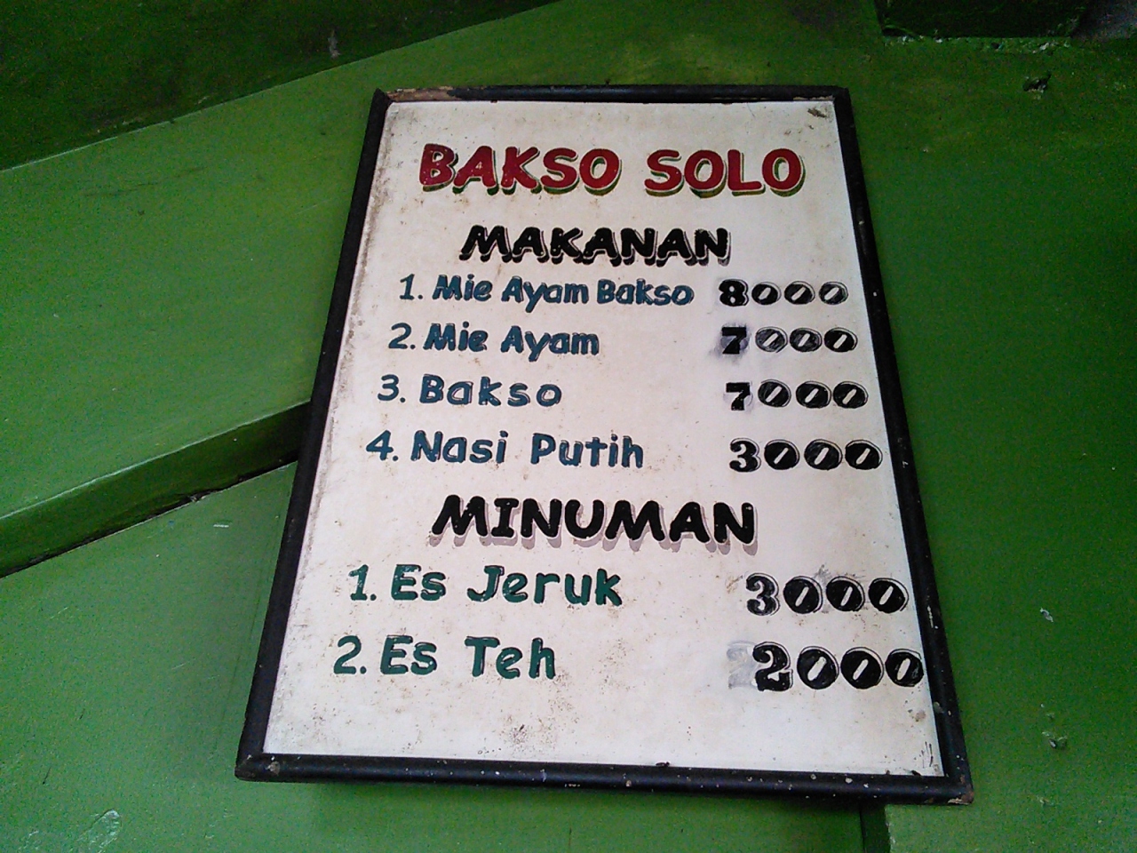 店名からもわかるようにソロ(ジャワ中部の都市)風のバクソーのようです。客が絶え間なく入っており食事時には大勢の人でにぎわっています。専門店らしく壁に掲げられたメニューはミー アヤム バクソー(Rp8000)、ミー アヤム(Rp7000)、バクソー(麺なしRp7000)、ナシ プティ(Rp3000)の4種のみ。この辺りからもこだわりが感じられます。
