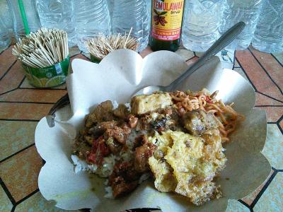 パダン・トゥガルとプリアタンの間付近にあるローカルワルンです。おかずを指定せずRp10000のおまかせでナシチャンプルを食べました。いつもおまかせにするとどんなおかずが盛られてくるか楽しみなのですがこの店はサテイカン(竹へらに塗られた魚のすり身のサテ)が付いてきました。他には鶏肉をほぐしたもの、卵、テンペ、野菜などが盛られてなかなか豪華でした。味も申し分なし。