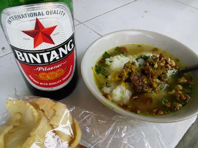 ブブルアヤムとはインドネシア風の鶏肉入りのお粥のこと。この店のものは汁なし状のドロドロしたご飯を最初にどんぶりに入れ、後からダシ汁を注ぎます。トッピングは炒りピーナッツ、刻んだ青菜、ビーフン、パクチー、そして鶏肉。これでお値段なんとRp5000。なので本格的というよりは軽めにささっと食べる感じで量も少なめですが味はかなりイケます。汁はカレー風味でピーナッツがアクセントになり病み付きになるおいしさです。また、この商店ではビンタンビール(大びん)がRp30000で買え店内で飲めます。ビールの後のブブルアヤムで極楽気分になれます。