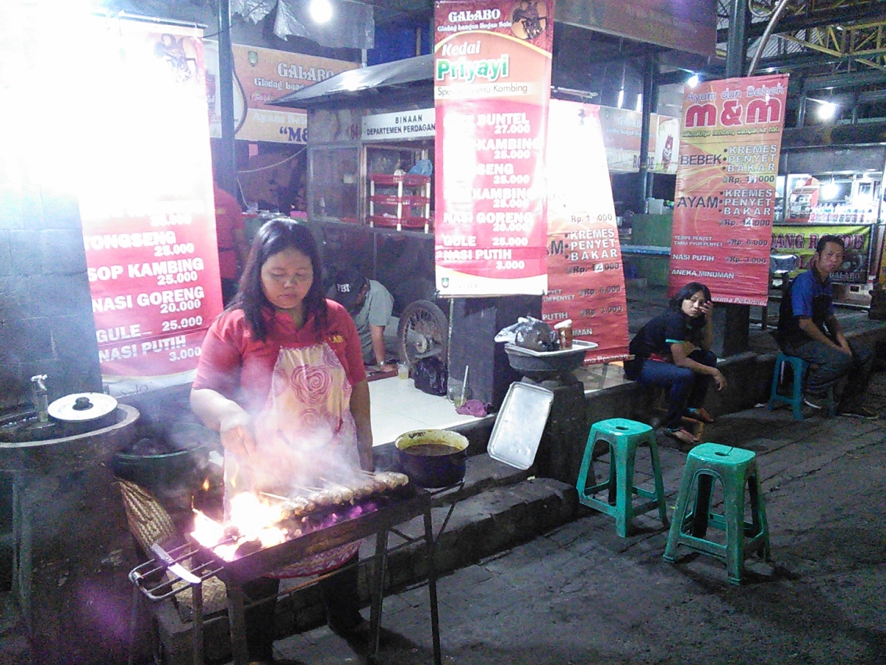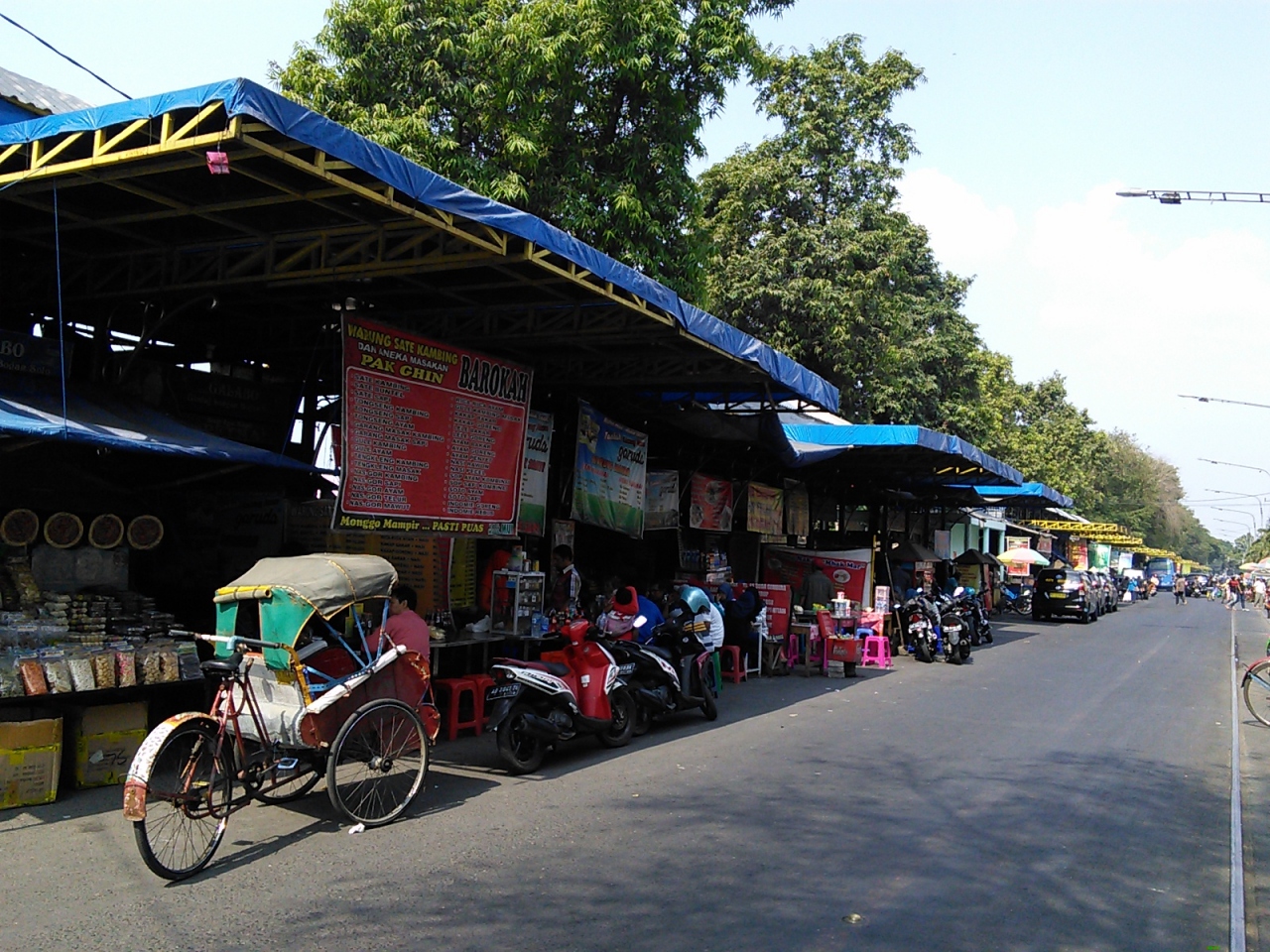ソロの街を東西に貫くJalan Slamet Riyadi沿い、カスナナン王宮北広場から始まる屋台の集合体。夕方はからは前の通りを歩行者天国にしてイスとテーブルか並びます。しかし平日の夜は人は閑散、路上で音楽の演奏もありますがかえって寂しさを助長しているようです。週末は多少人出があります。完全ローカルの屋台かといえばそうではなく若干のツーリスティックさもあります。値段もやや高め。