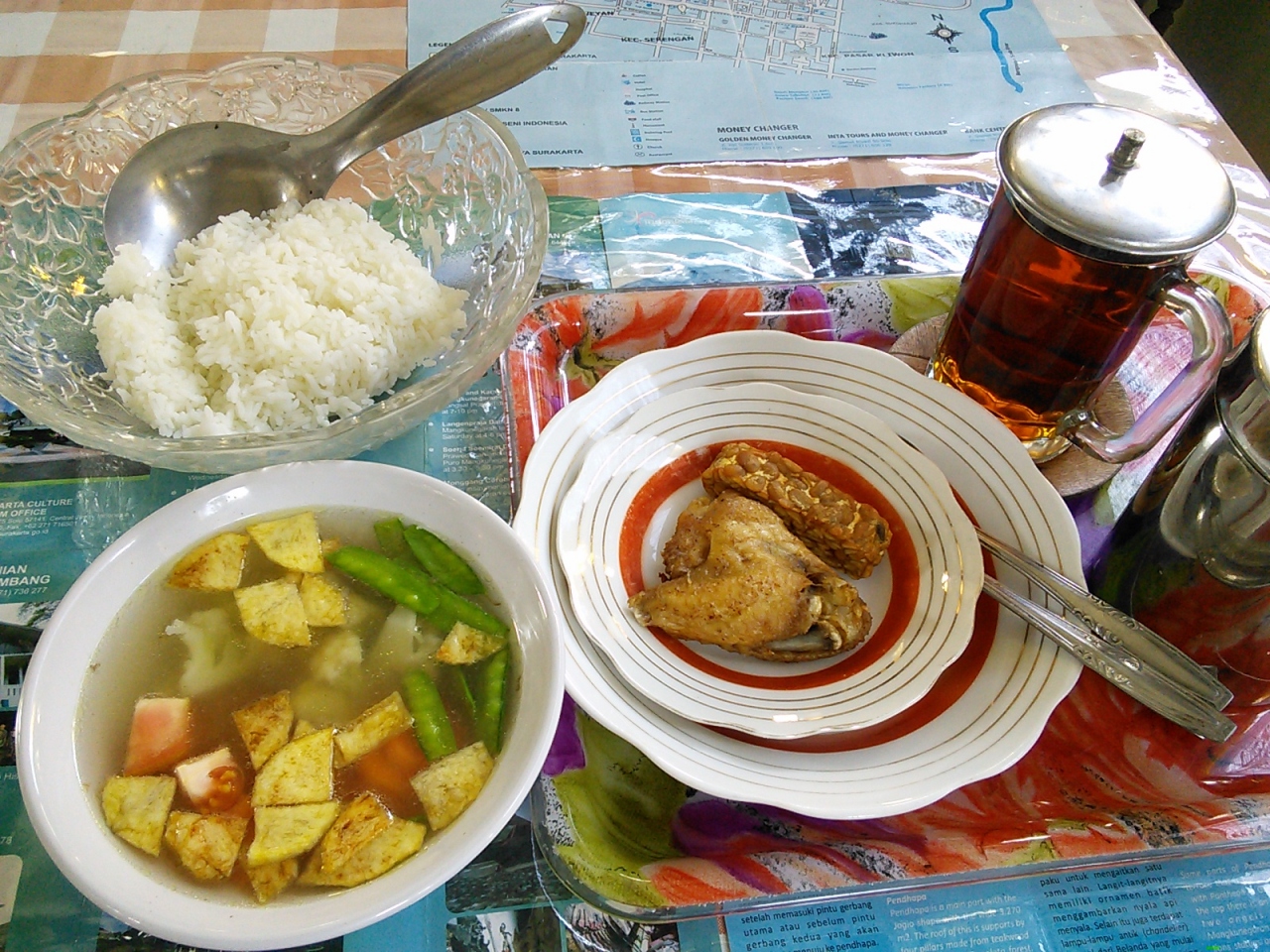 しかし、これらのマイナス面をカバーするのが日替わりの朝食です。もちろん無料。写真は一例ですがご飯に野菜スープ、テンペゴレン、アヤムゴレン、コーヒーor ティー。とかなり豪華。朝からこれだけ食べればお腹いっぱいです。おしゃれな盛り付けのナシゴレンの日もありました。