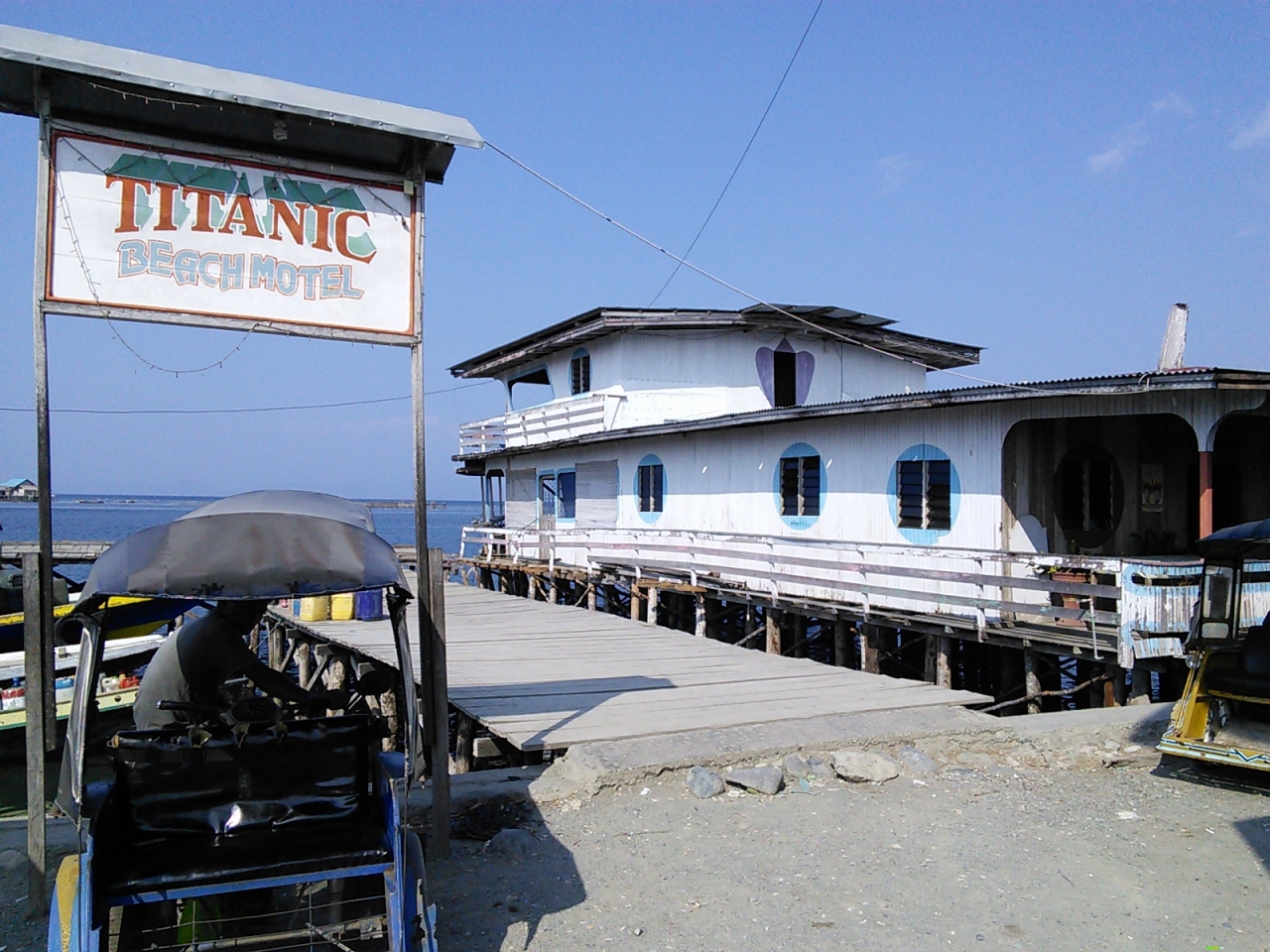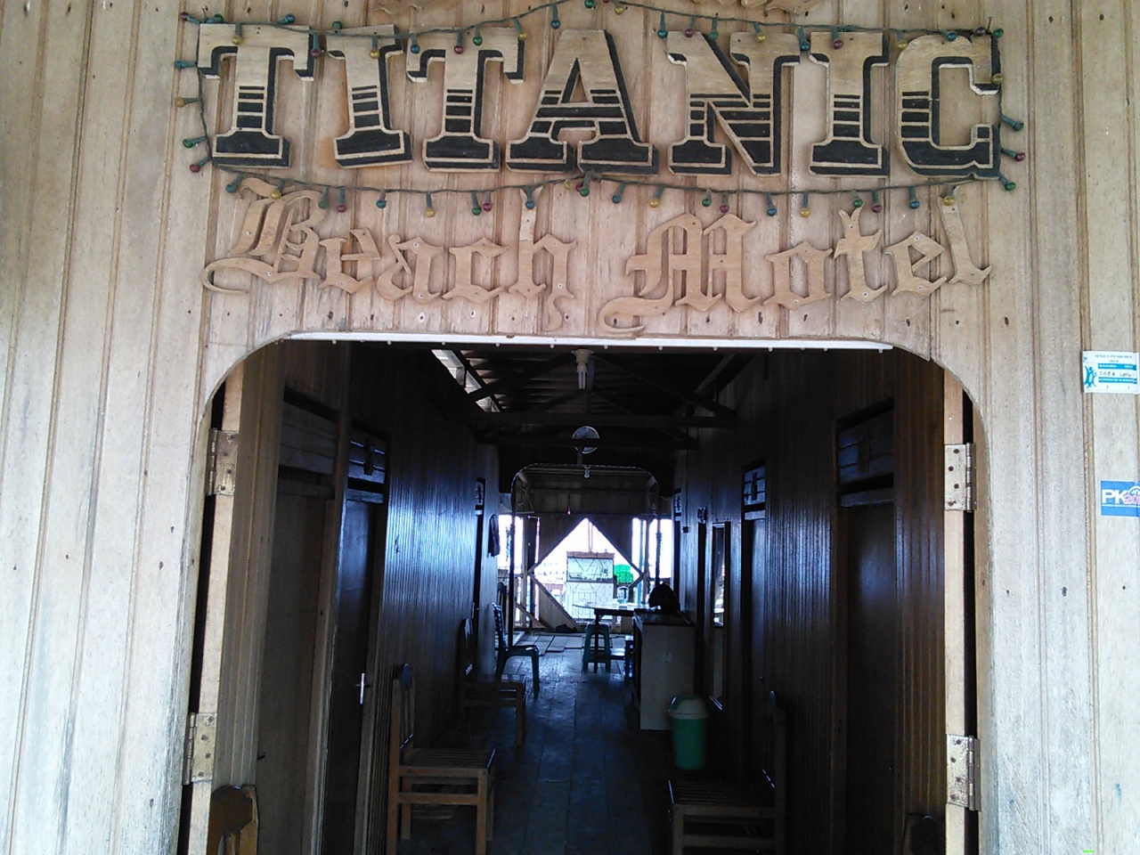 パギマナの町を散策していて見つけた驚くべきホテル。一言で言うと“ボロかっこいい”。なんとホテル自体が船の形(タイタニック号?)をしていて海に突き出しています。木造でかなり年季が入っていますがそのたたずまいがのんびりとしたゆる~いパギマナの町並みに妙にマッチしていてとてもいい雰囲気です。これは泊まらなければ一生後悔する(ちょっと大袈裟ですが)と思い前日の宿を変更して泊まりました。町のメインストリートJalan Trans Sulawesiがクランク状に曲がった辺り(商店が多く集まった一番賑やかな場所)の海沿いにあります。