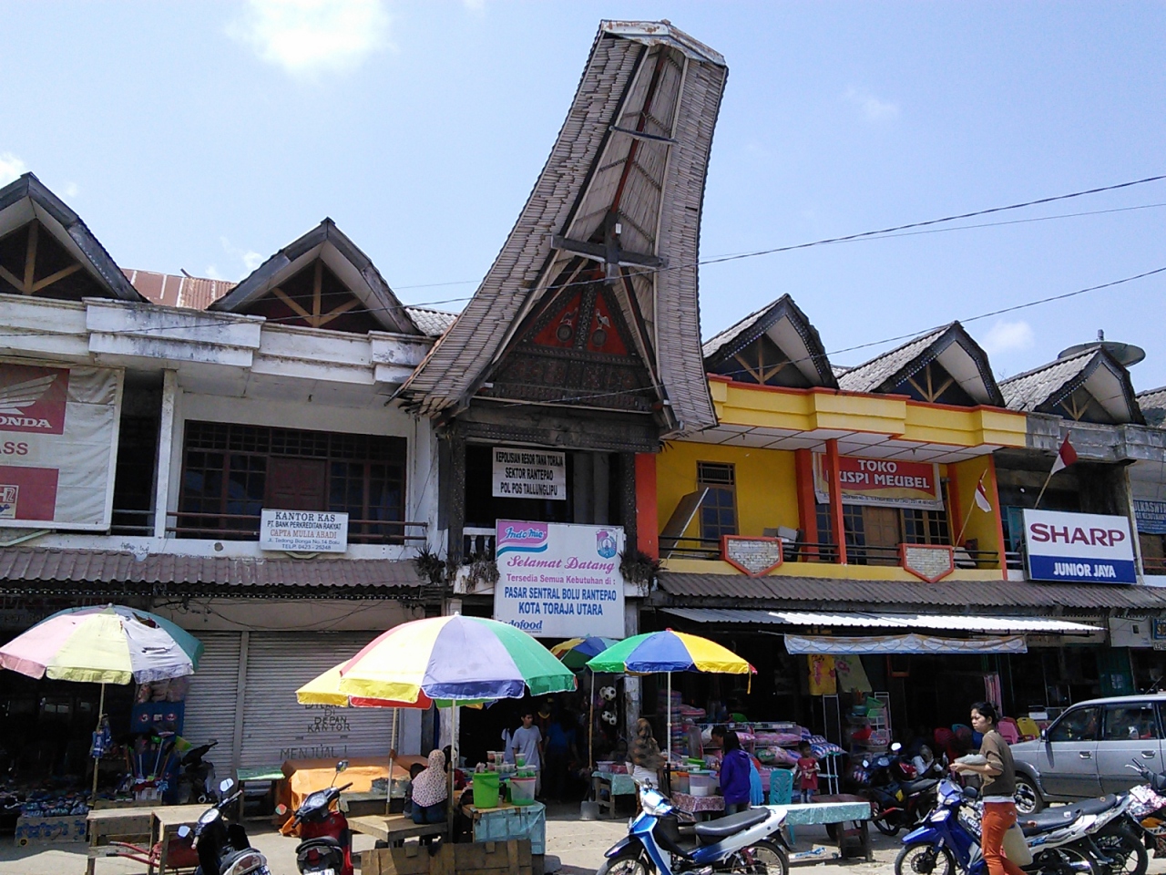 ランテパオの市街北東2kmほどにある大きな市場です。衣類、生活雑貨はもちろん、肉や魚、野菜、果物の生鮮品、乾物、竹で編んだカゴ、ゴザ、刃物類などなど。とにかく内部は広く迷路のようです。もちろんトラジャコーヒーもあります。豆、粉末どちらの状態のものも揃っています。ランテパオ市内よりもお値打ちで買うことができます。