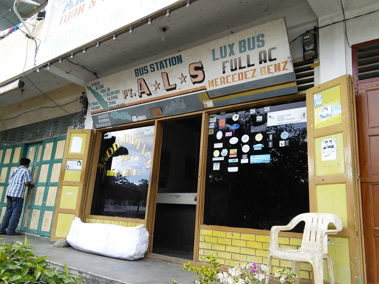 パラパッの船着場近辺や町中にもバスのチケットオフィスや旅行代理店はありますがとりあえずパスターミナルに行ってみました。各方面へのバスが待機していてチケットが買えると思いきや…、辺りは閑散。ついつい他の町と同じかと思っていましたがトバ湖はかなりの田舎のようです。コピを飲んでいるおっさんにブキティンギに行きたい旨を伝えるとアソコだとバスターミナルの一角を指差しました。開いてるのか開いてないのかわからないようなバス会社のオフィスがぽつん。声を掛けると奥からおっさんが出てきました。ブキティンギまでは24万Rp。高いのか安いのかわかりませんでしたが、おっさん曰く町中で買ったら30万Rpだぞと言われたので買いました。出発は2時間後の17:30。