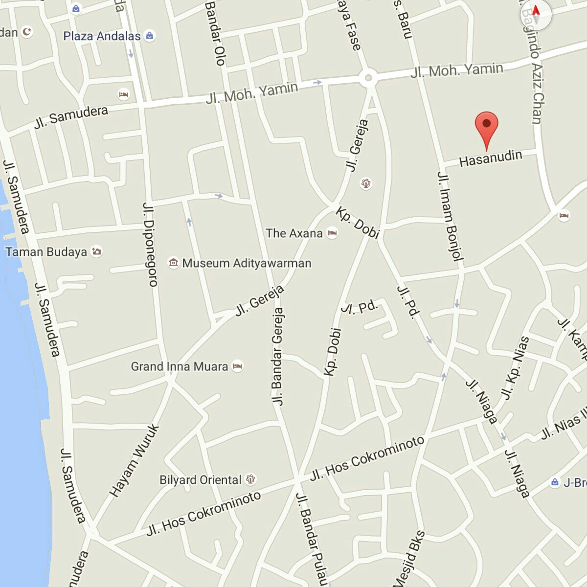 Jl.Veteranを走る前面に「KAMA」と書かれた青と緑のミニバスで所要15分ほど(Rp3000)。もちろん歩いても行けます(所要45分)。Jl.Veteranを北上、戦闘記念碑のあるロータリーを斜め左へ、シバヤッ インターナショナル ホテルの手前の三差路を右、後は道なりです。ミニバスと同じルートを歩くことになります。私は宿でもらった地図を参考に歩きました。