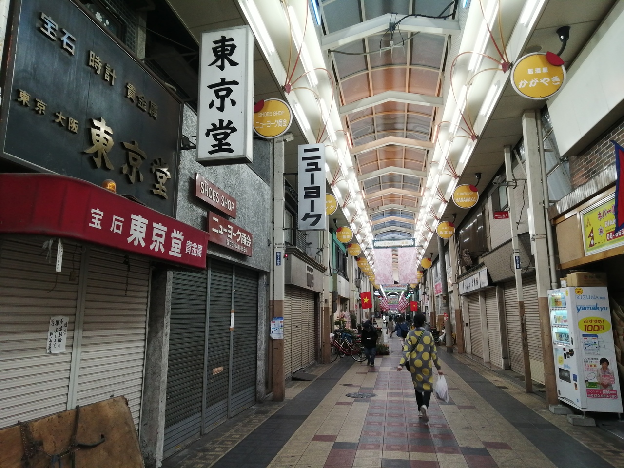 おいしい串かつ屋があると聞き、鶴見橋商店街に行ってみました。時刻はまだ19時過ぎ、ほとんど店閉まっとるやないか。まさにゴーストタウン。レトロな雰囲気の商店街を楽しみにしていたのにがっかり。しかし、“東京堂”と“ニューヨーク”という名の店が並んでいるのを見た時は思わず笑ってしまいました。今回は目的が違ったのでまぁよし。次回は賑わってる時間帯に行ってみたいと思います。
