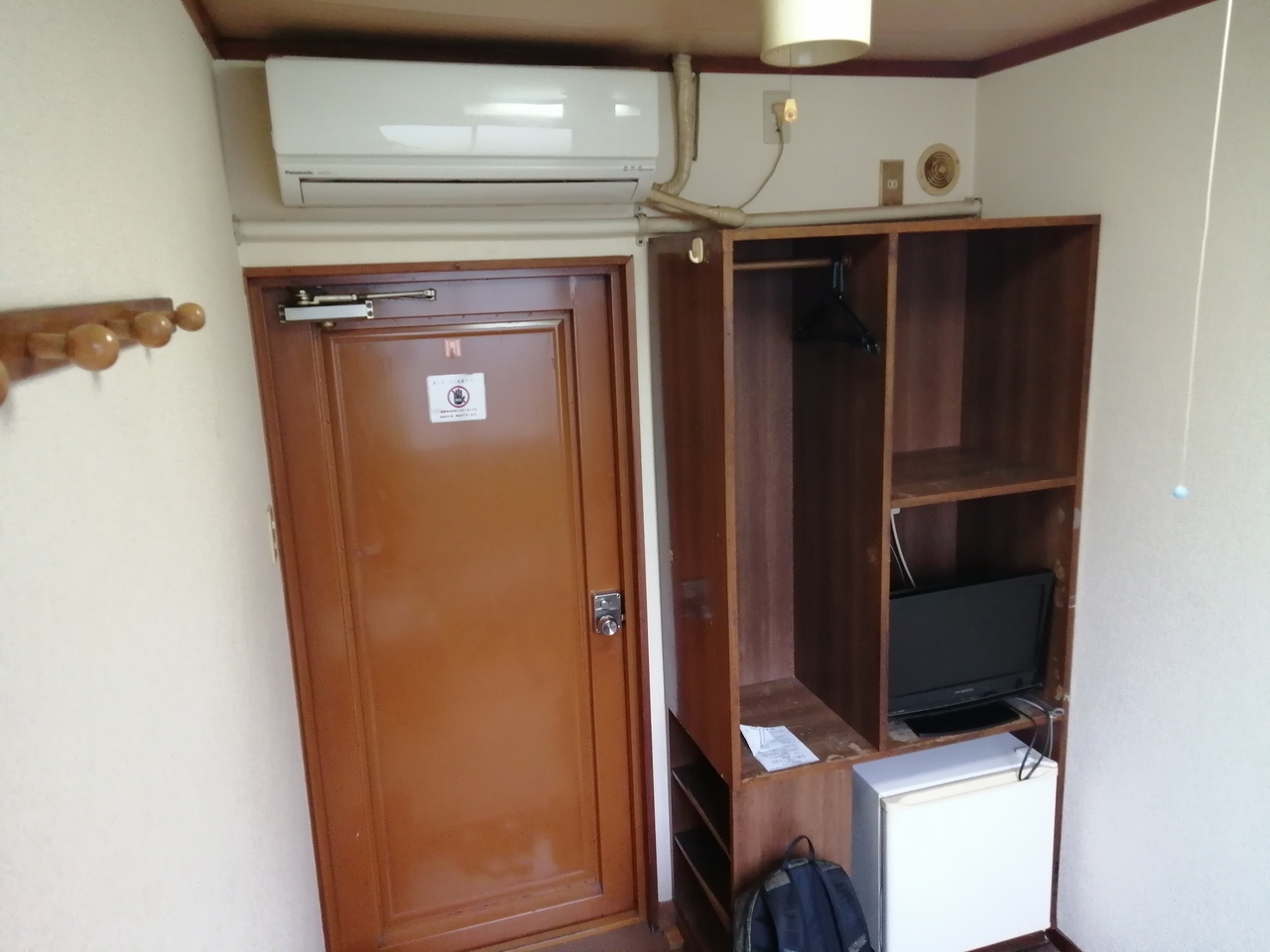 このホテルも一応ドヤというんでしょうか。入口はしっかりしていますが、部屋は3畳ほどの畳敷き。エアコン、テレビ、冷蔵庫完備。小さなテーブルもあります。室内、寝具はとても清潔なのですが、タバコの臭いが気になりました。トイレ、シャワーは共同、湯船のある浴場もありますが1泊に付き1枚の近所(徒歩2分)の銭湯「入船温泉」の入浴券がもらえます。これはいいサービスだと思います。