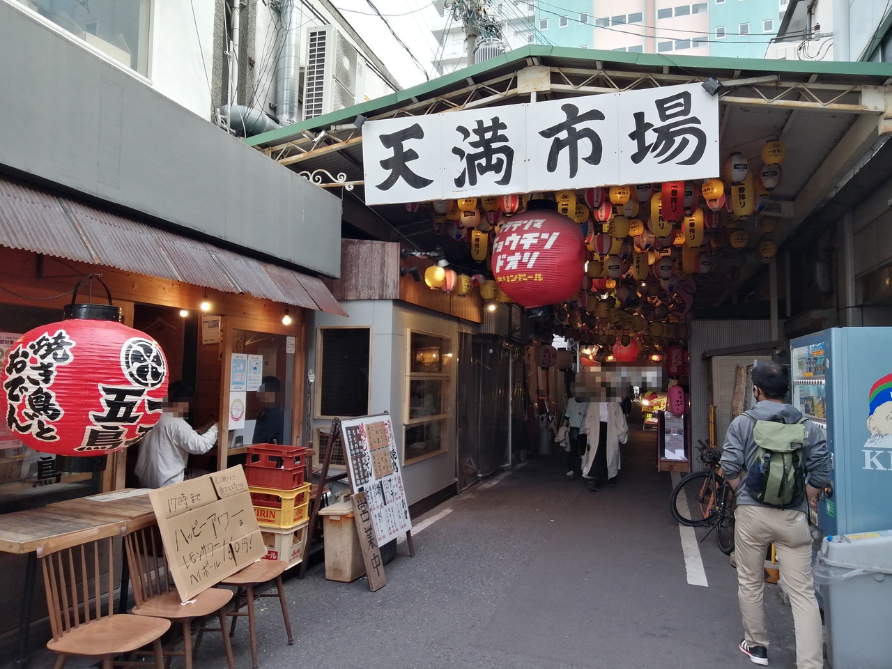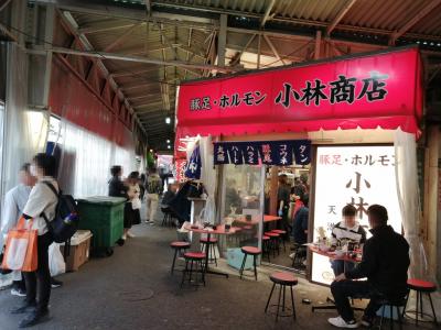 天満市場の周囲には庶民的な飲み屋が並んでいます。特に北側のアーケード街。天井には提灯が吊られていて雰囲気満点。おすすめは「小林商店」。ホルモンや豚足が食べられる昭和の香りの残る店です。天満市場は買い物目当てではなく飲み目的で訪れてもとても楽しいところです。