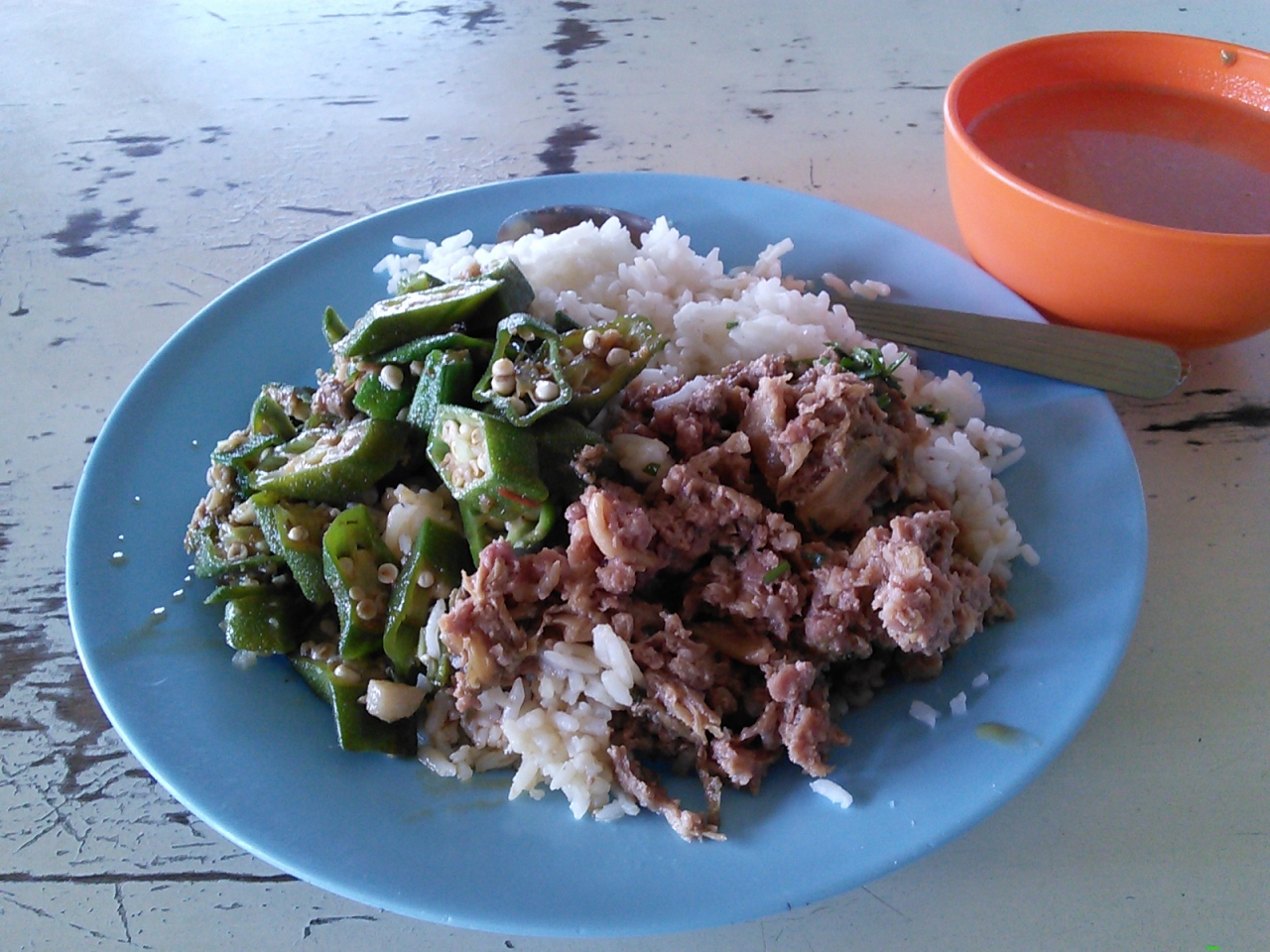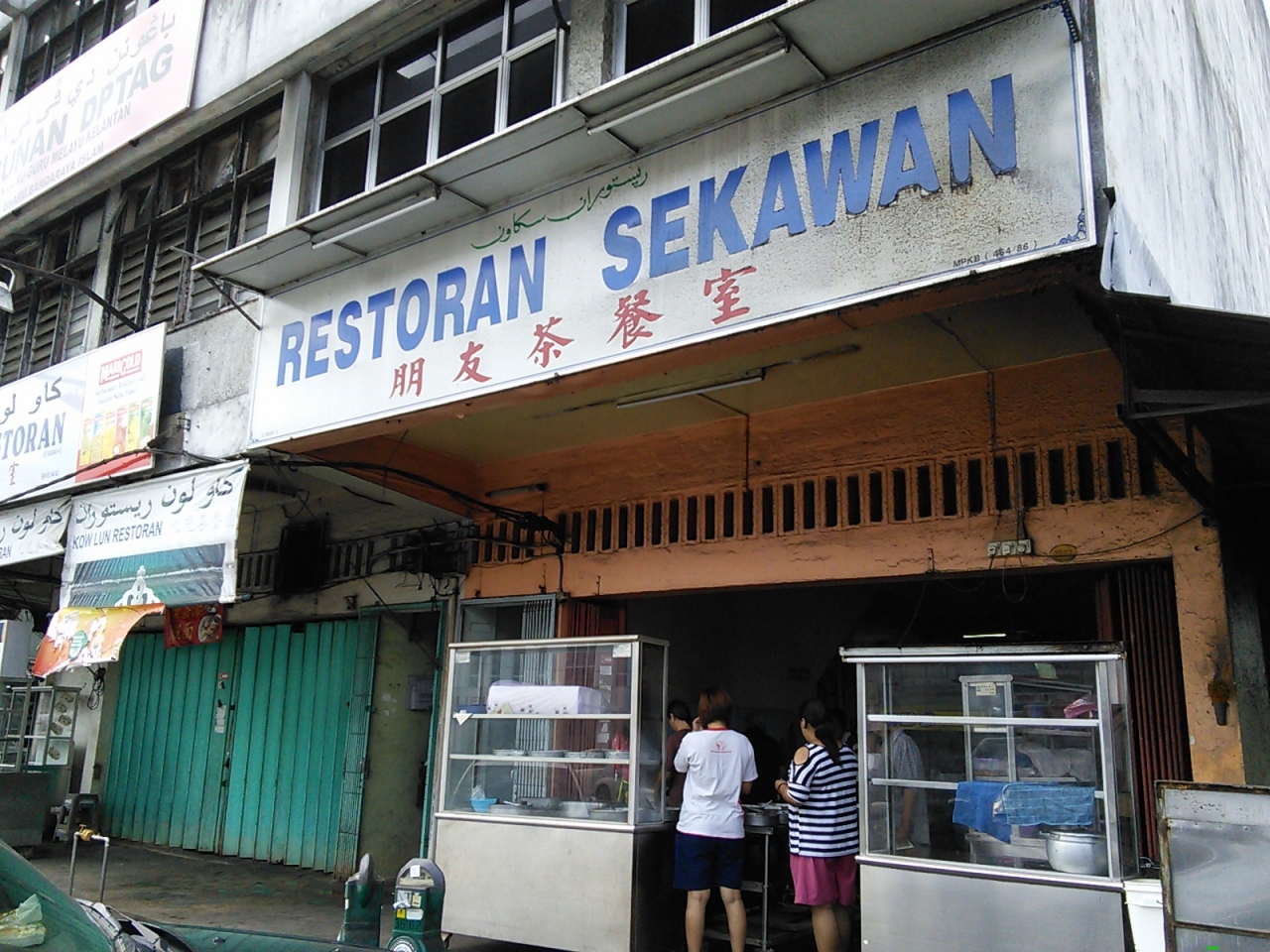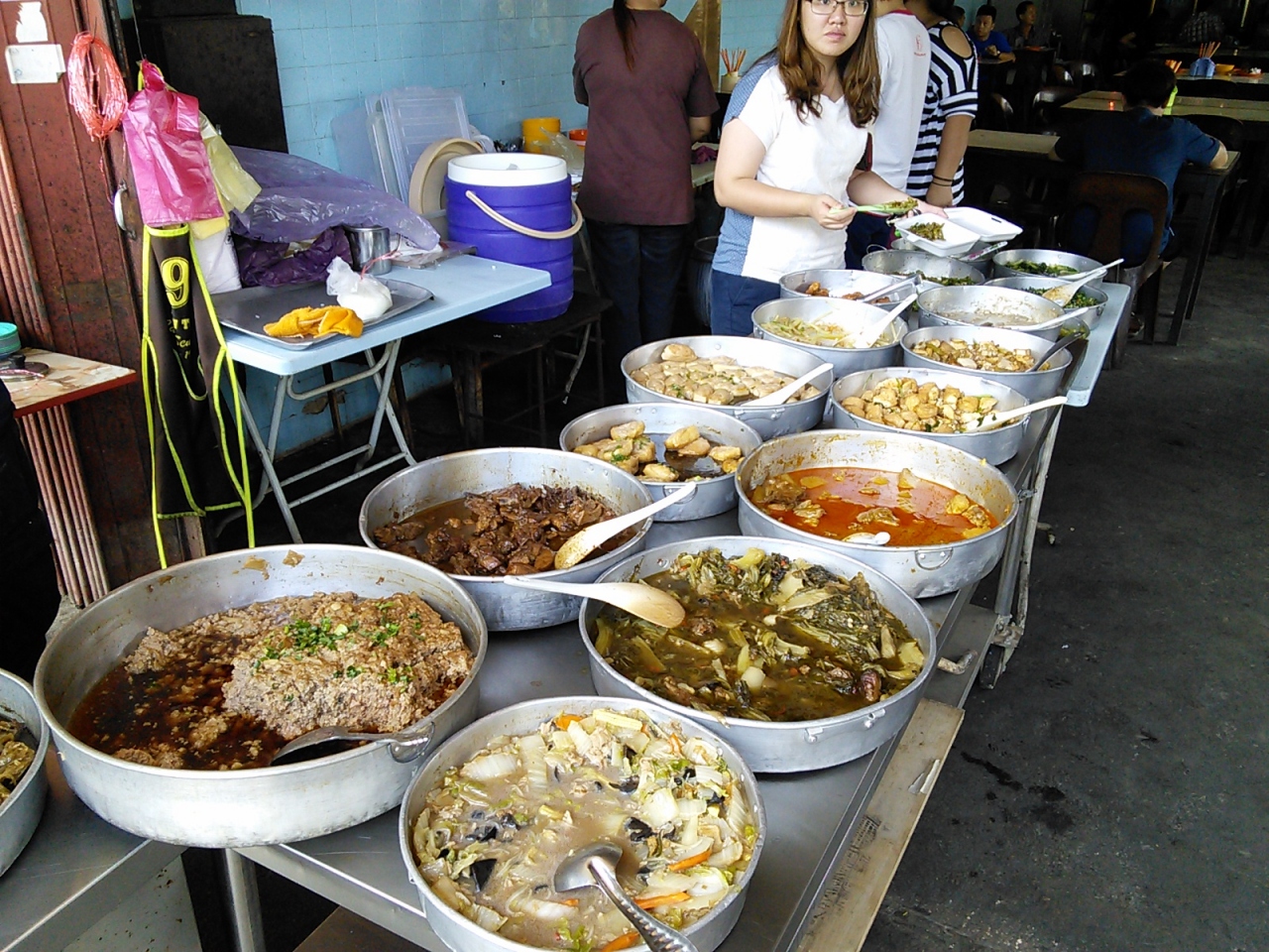 チャイナタウンエリア、ケブンスルタン通りの「Public Bank」横のセブンイレブンの向かいにある中華食堂です。詳しくは写真の地図参照。昼12:00になると経済飯が始まります。バットに入ったおかずが並んでいる、いわゆるぶっかけ飯です。もちろんおかずの種類によって異なりますがご飯に2,3品のっけて3~5RMで食べられます。マレー料理では野菜を摂るのに苦労しますが中華食堂なら安くいろいろな種類のおかずが食べられます。スープは無料、入口近くの大鍋から自分でよそいます。ちゃんと豚骨のダシを取っているのでおいしいです。昼時には結構混んでいます。