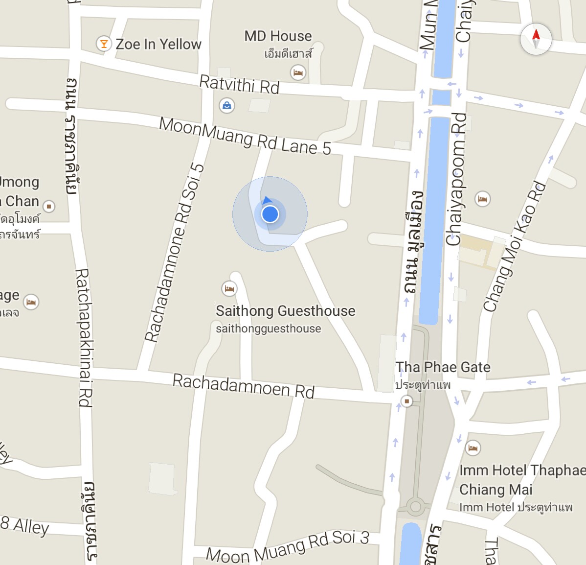 場所はターペー門を入り真っすぐ、ラチャダムヌン通り1つめの路地を右折(門から約20m、バーガーキング横)し100mほど入ったところです。詳しくは写真地図参照。