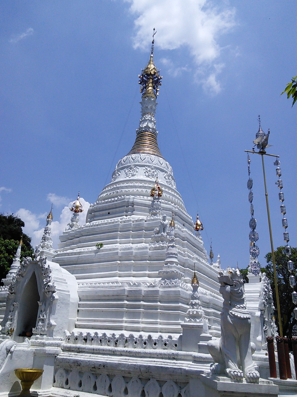 ターペー通りに立派な入口があります。鉄格子があり入っていいのかなという感じですが大丈夫、見学自由です。蛇神ナーガの間の通路を進むと白い装飾の鮮やかな仏塔があります。その横のお堂にもぜひ入って下さい。赤色を基調とした美しい造りです。天井を見上げると十二支と思われる飾りが施されています。この寺院はワローロット市場からも近いのでついでに立ち寄ってみてはいかがでしょうか。