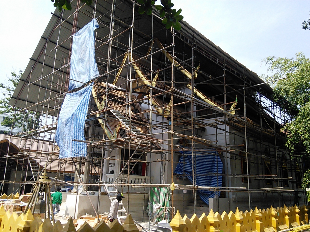 入口を入りまず目に付くのは黄金の仏塔。その手前に小さな真っ白い仏塔がいくつも建っています。これにはチェンマイ王朝歴代の王族の遺骨が納められておりなかなか壮観な眺めです。正面に見える大きな建物は礼拝堂でこの日はまたまた敷地内にある大学の卒業式が行われていました。そのため堂内にある500年前に造られたという国内1,2を争う大きさの青銅の仏像を間近でゆっくりと見れなかったのが残念でした。残念と言えば境内奥にある本堂が修理中で見学できなかったこと。ちょっと中を覗かせてもらいましたが釈迦の生涯を描いたという色鮮やかな壁画は見当たりませんでした。どこかに移動中なのでしょうか?見たいものがいずれも見れず消化不良に終わりました。