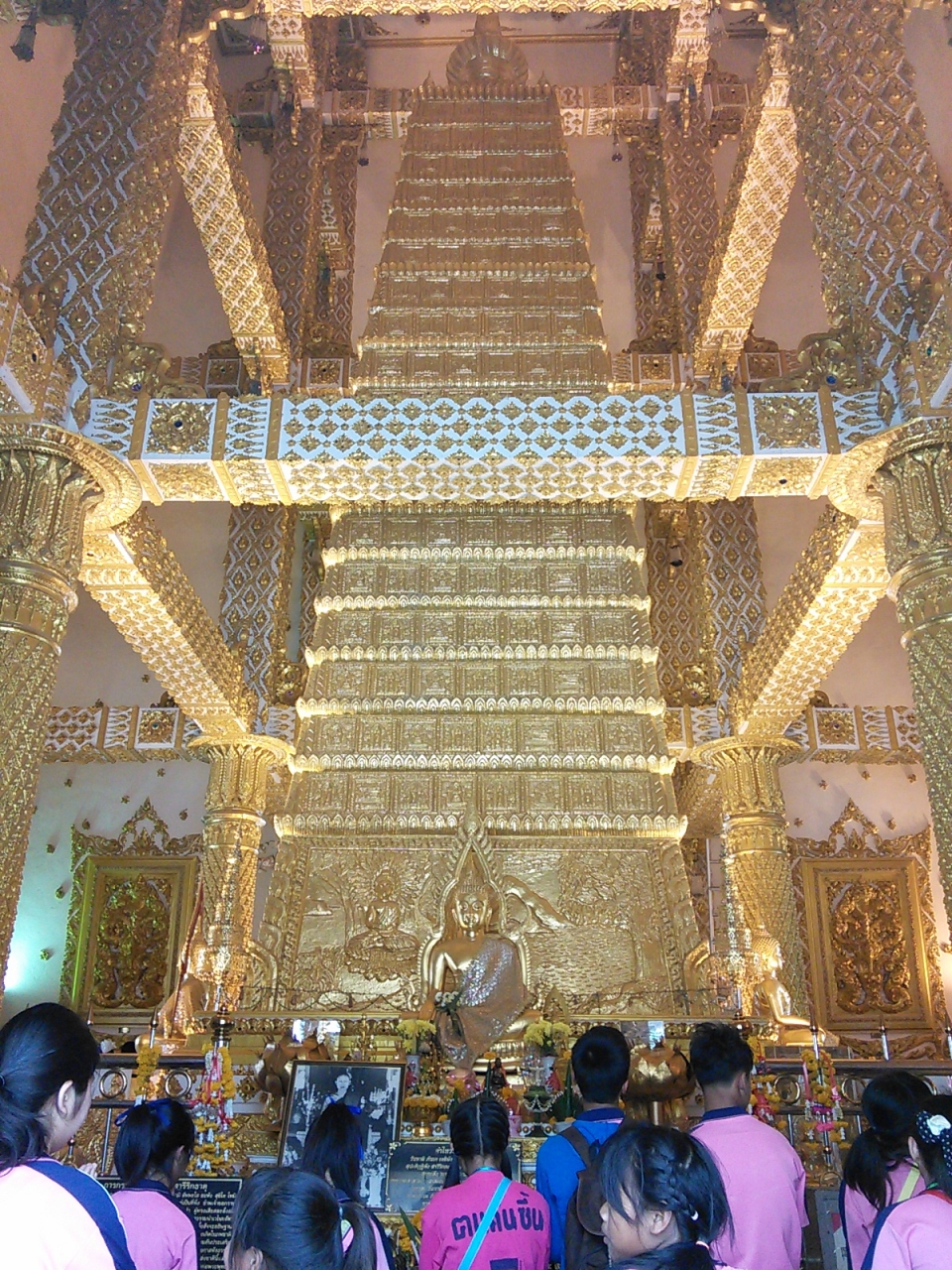 インドっぽいなと思いましたが実際にインドのブッダガヤにある仏塔を模したもののようです。四角すいの形をした高さ56mの真っ白な仏塔は美しいの一言です。内部にはさらに黄金の小仏塔が建ち四方にはそれぞれ黄金の仏像が置かれています。かなり見応えがありますが入場無料です。境内内には他にロウソク祭りで使用されたであろう見事な彫刻を施されたオレンジ色のロウソクが展示されています。
