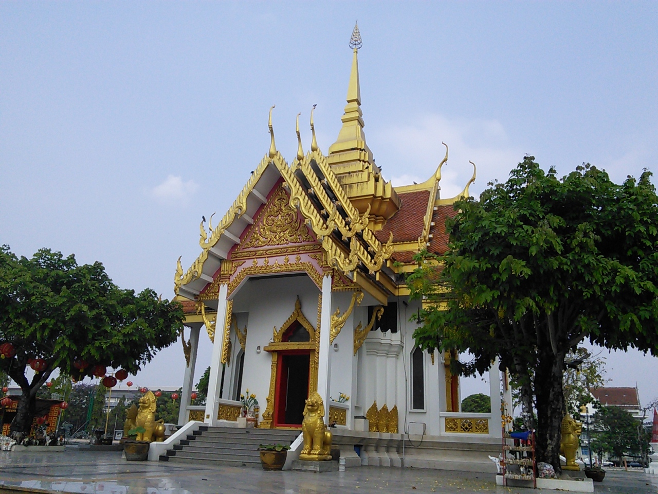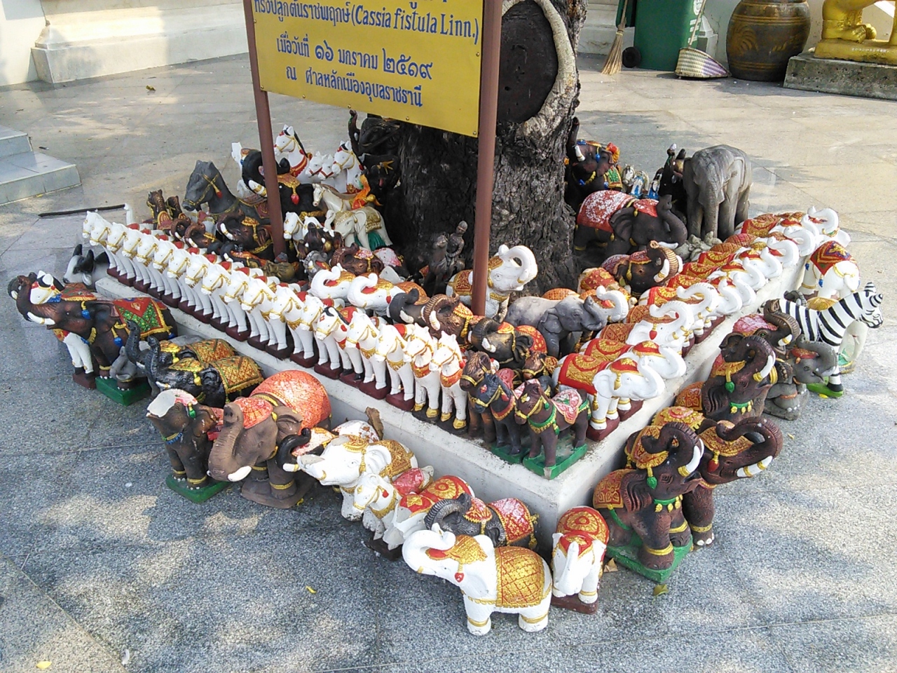 トゥン・シー・ムアン公園南側の一画にあります。“市の柱(ラク・ムアン)”と聞いても我々日本人には馴染みがなくピンときませんが、これは市の守護神を祭るためのものでタイの各都市にあります。信仰の対象になっているためみんな参拝に来ています。また、健康祈願や宝くじに当たりますようになどのお願い事もできるようで建物の周り四隅にある木の根元にはそのための置物が置かれています。ゾウやウマ、ニワトリなどがあり面白いです。