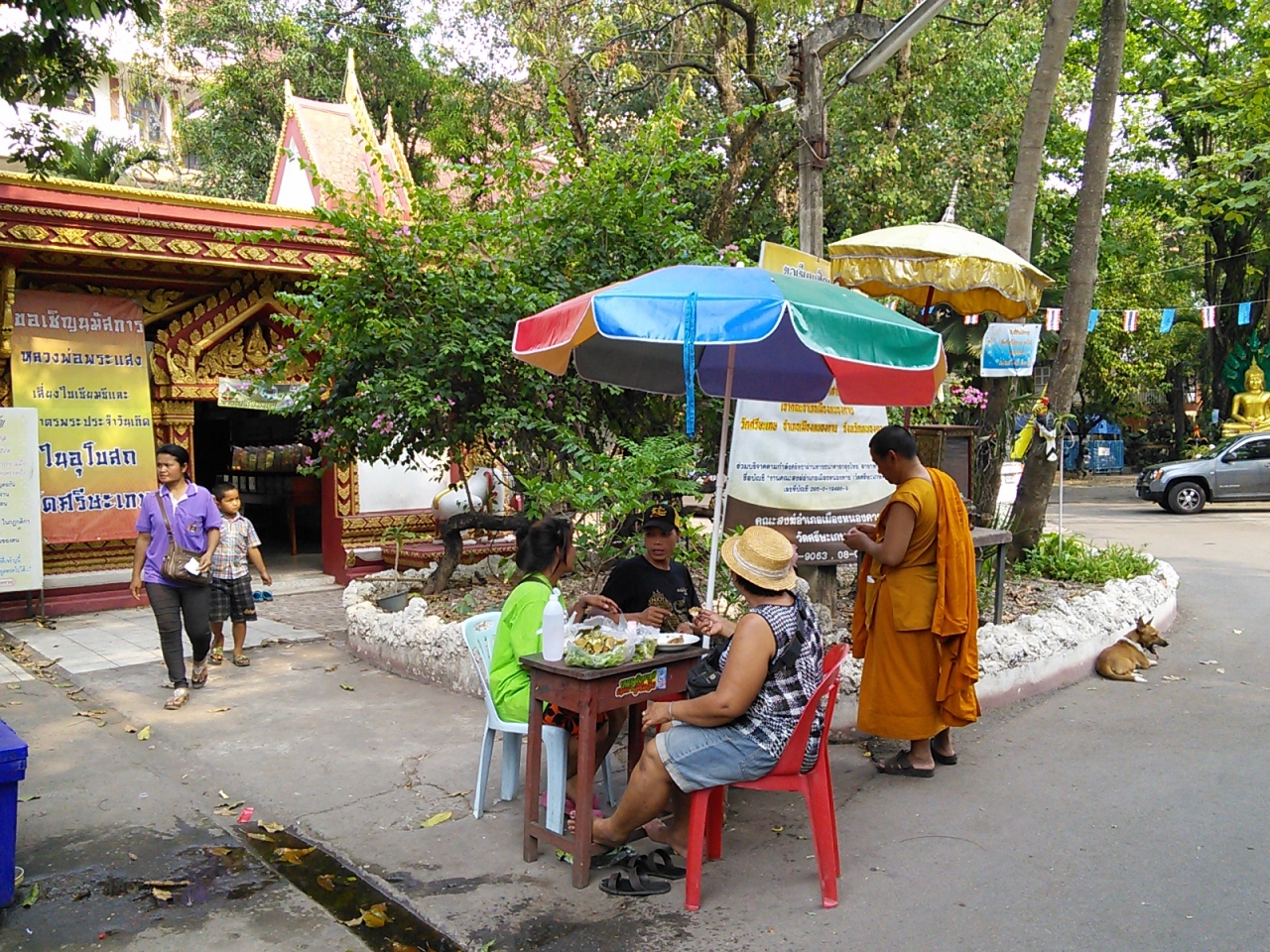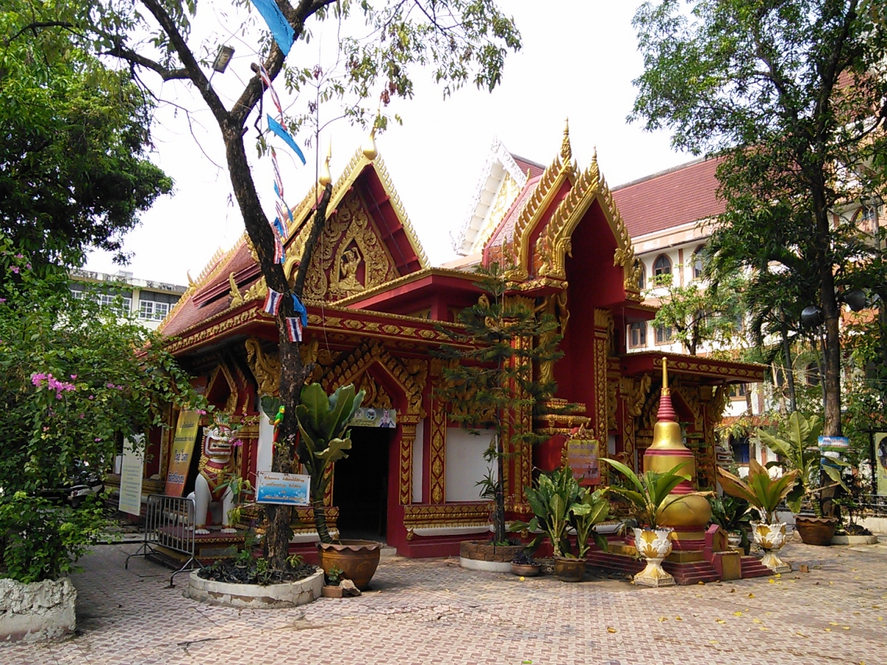 第一印象はあまりぱっとしない感じ。本堂もタイ寺としては小さく地味で敷地内もあまり手入れされていませんでした。この周囲の寺と同様に観光客用の駐車場と化しています。ちなみに1回30B。金儲けとしてやっているのか慈善的にやっているのかはかわりませんがいずれにしても境内に車が並んでいるのはあまりいい光景ではありません。見学する意欲も萎えてしまいます。