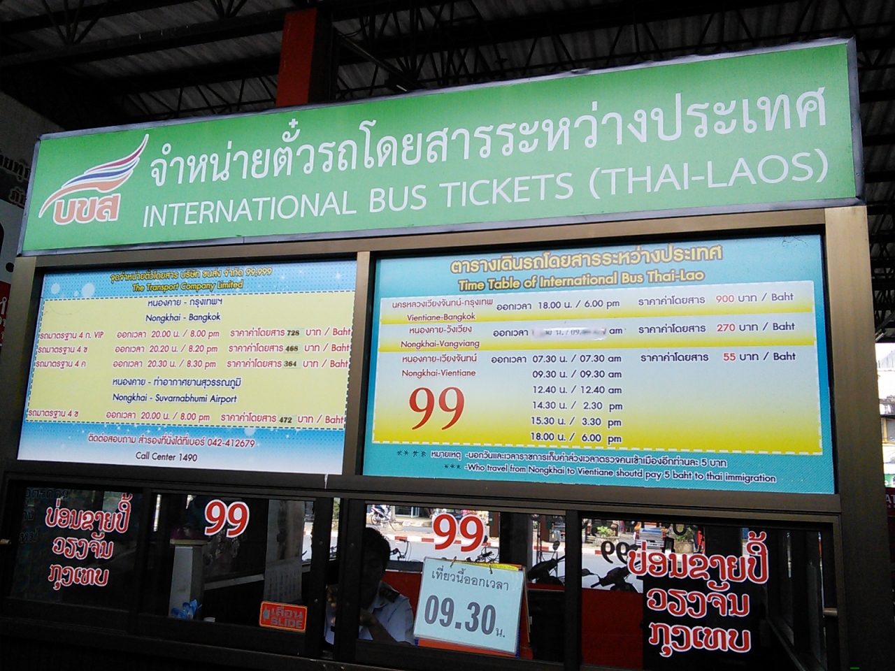 近郊の町や各都市へのバスが発着しています。バンコクはもちろんチェンマイやウボンラチャタニー、スワンナプーム国際空港行きなどもあります。またビエンチャン行きも1日6便(55B,出発時間は写真を参照)あります。