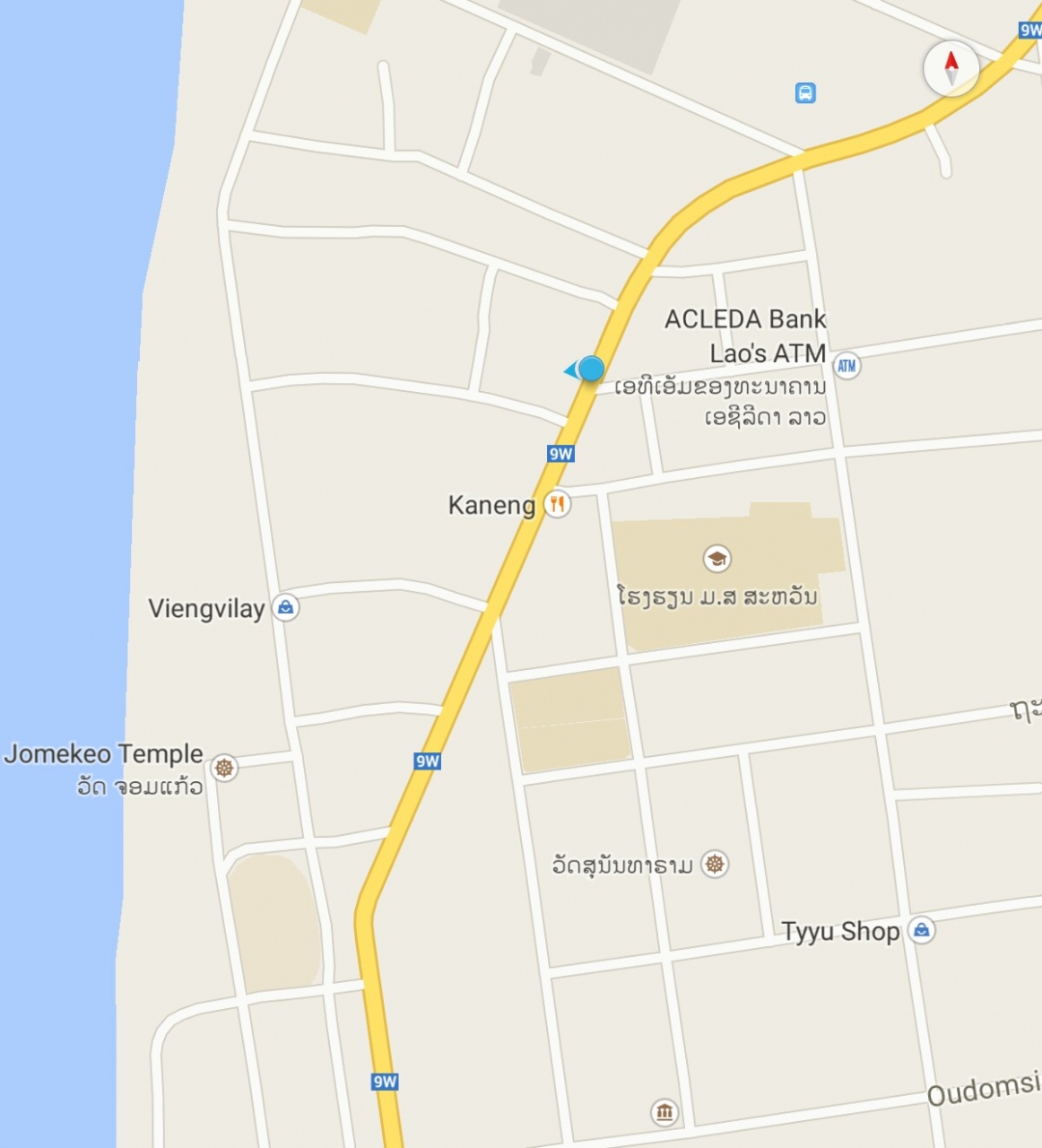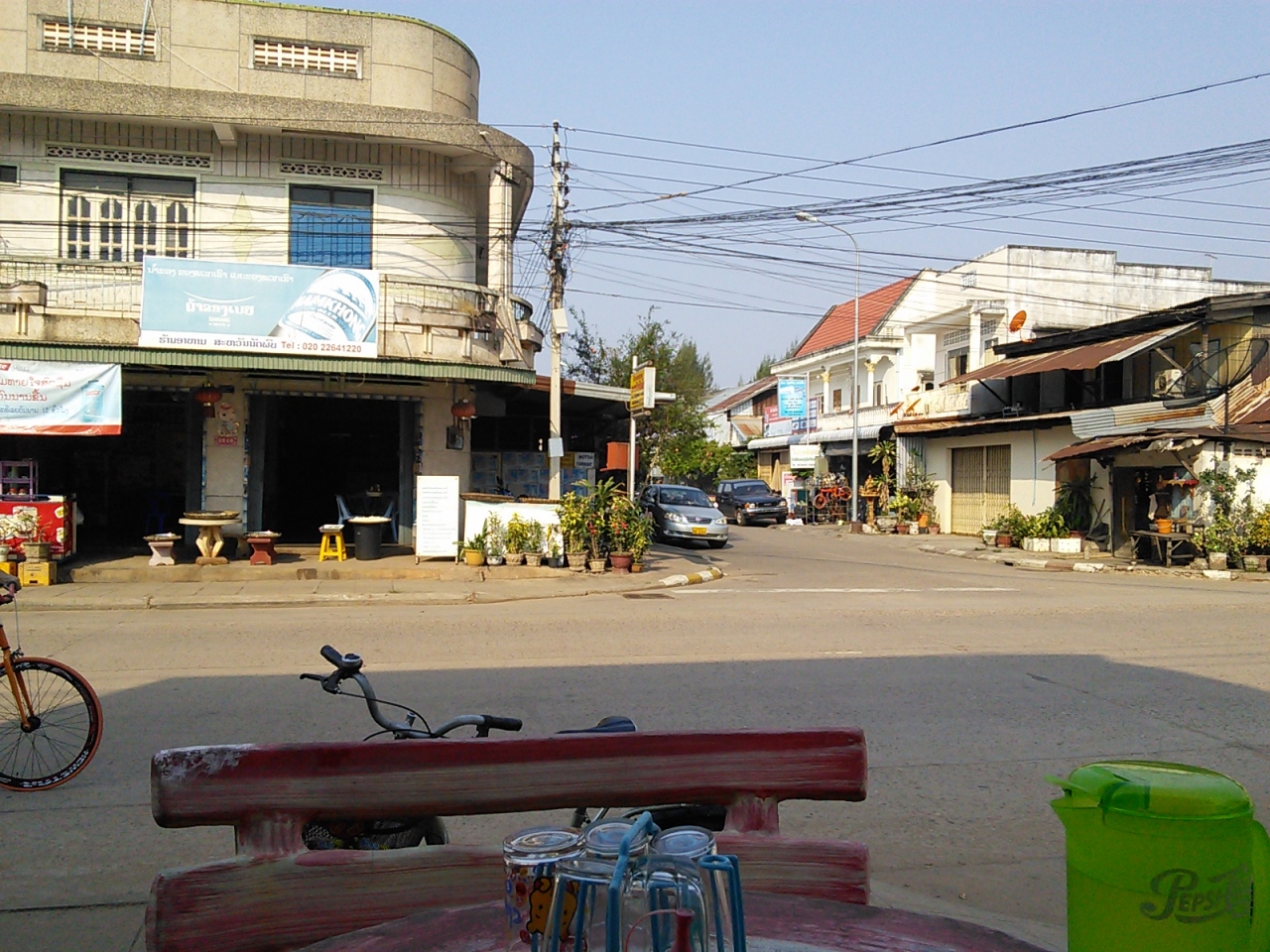 「コーナーカフェ」。なぜこのような名前で登録されているのかわかりませんが店自体はあります。店の名前を尋ねたら特にないとのことでした。場所はLatsavongsouk通りとSimuang通りの交差点の角。地図の場所も違っていますので添付した写真の地図を参照して下さい。