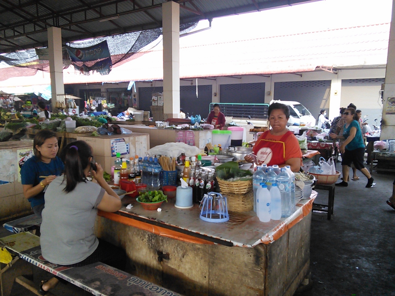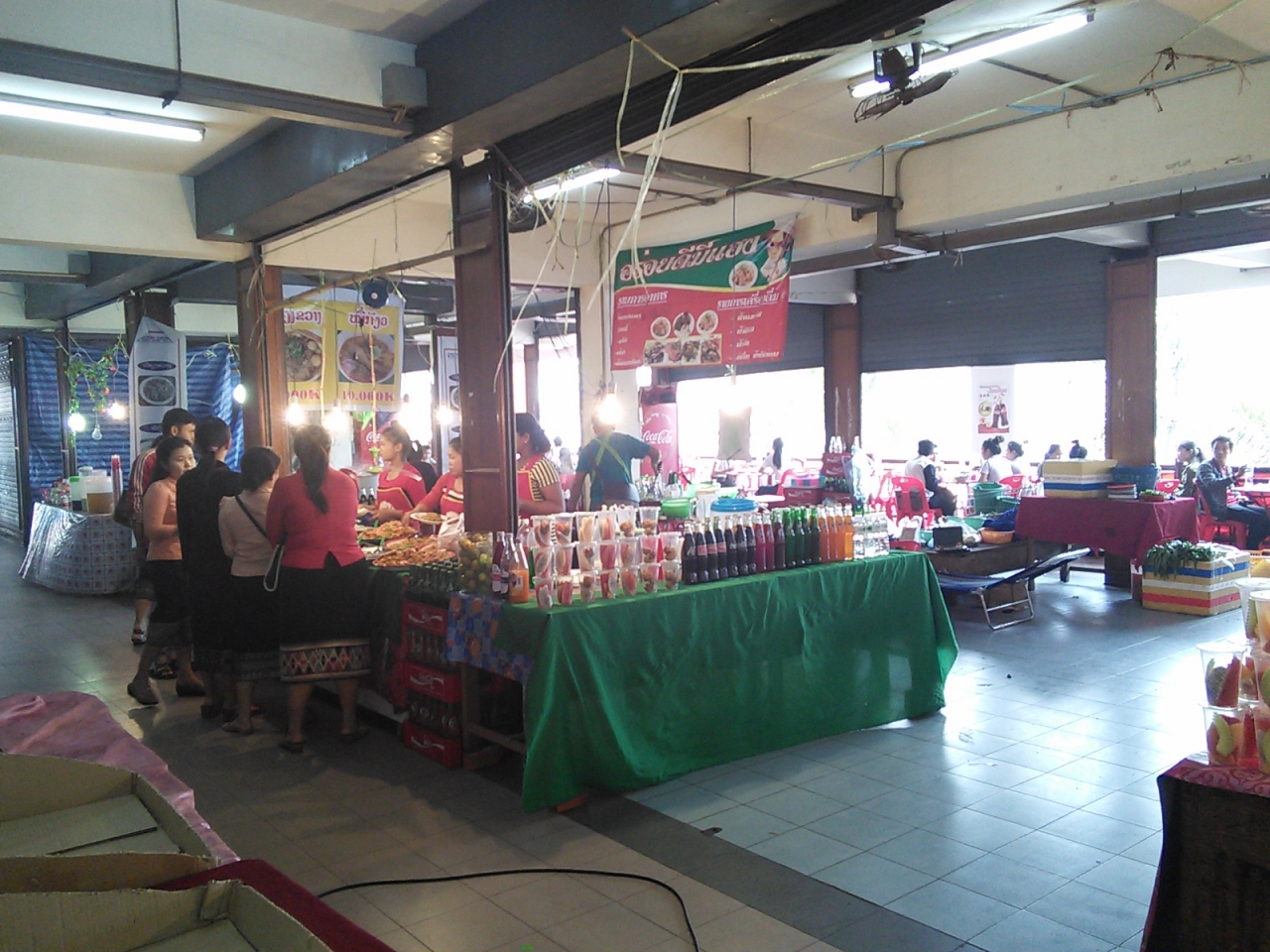 このショッピングセンター2Fにはフードコート?があります。麺類とご飯屋が1つずつと規模はかなり小さいですがなかなか洗練されていてしっかりしています。ご飯屋はおかずのバットが並んでいるいわゆるぶっかけ飯スタイル。どれもおいしそうです。2品選んで10000kipととってもリーズナブル。ソフトドリンクもありますが同じ2Fにスーパーマーケットがあるのでそこで買ってくれば安く済みます。ビアラオ大瓶も8500kipと超おトクです。麺類も何種類かあり10000kip。テラス席から市場を見下ろしながら食べられるので気持ちいいです。他に串ものやフライドチキン、インスタントピザを売る店もあります。夜は21:00頃までやってます。