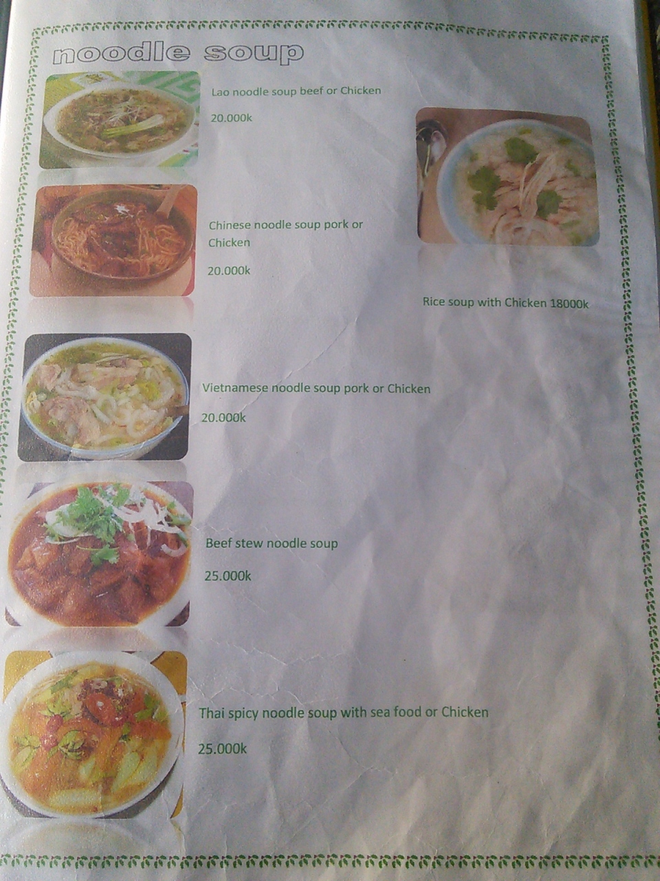 ローカルな店というよりはツーリスト向けの店です。メニューも写真付の英語表記なので注文しやすいです。麺類は20000kipからと若干高め。普通においしいですが麺を食べるならわざわざここでなくてもいいかなと思います。ローカルな店で食べたほうが雰囲気もあっておいしいと思います。- 旅行時期
