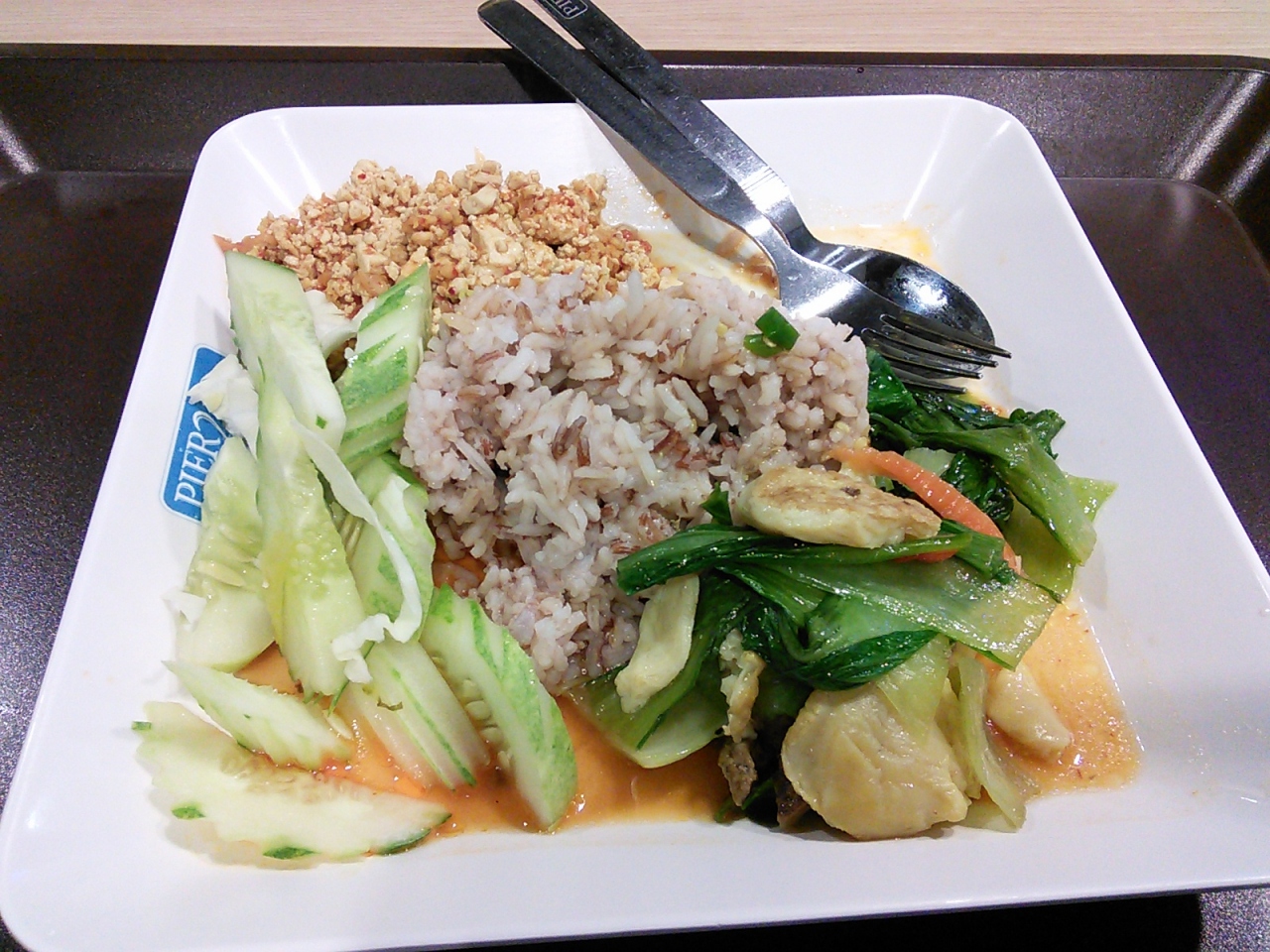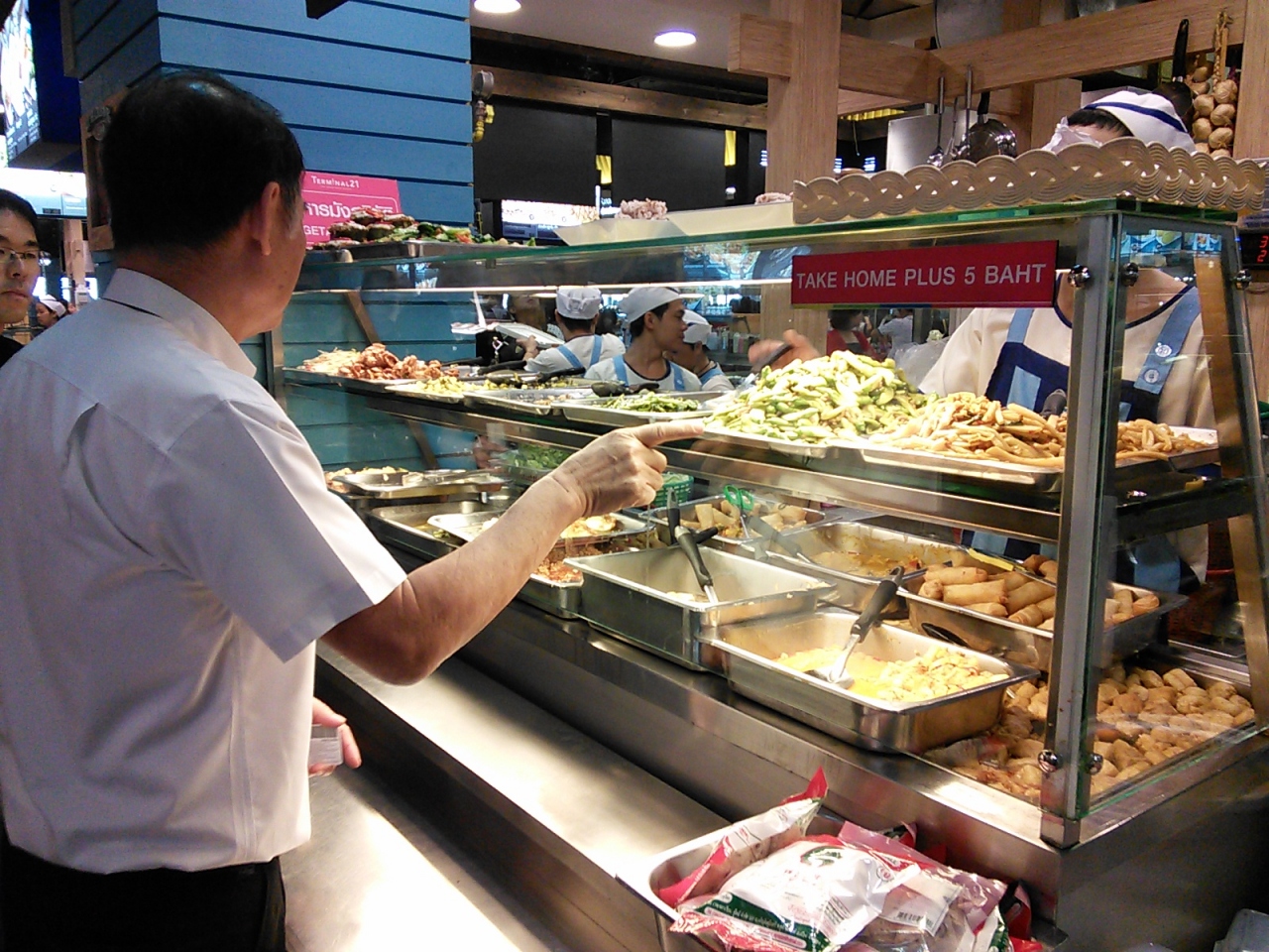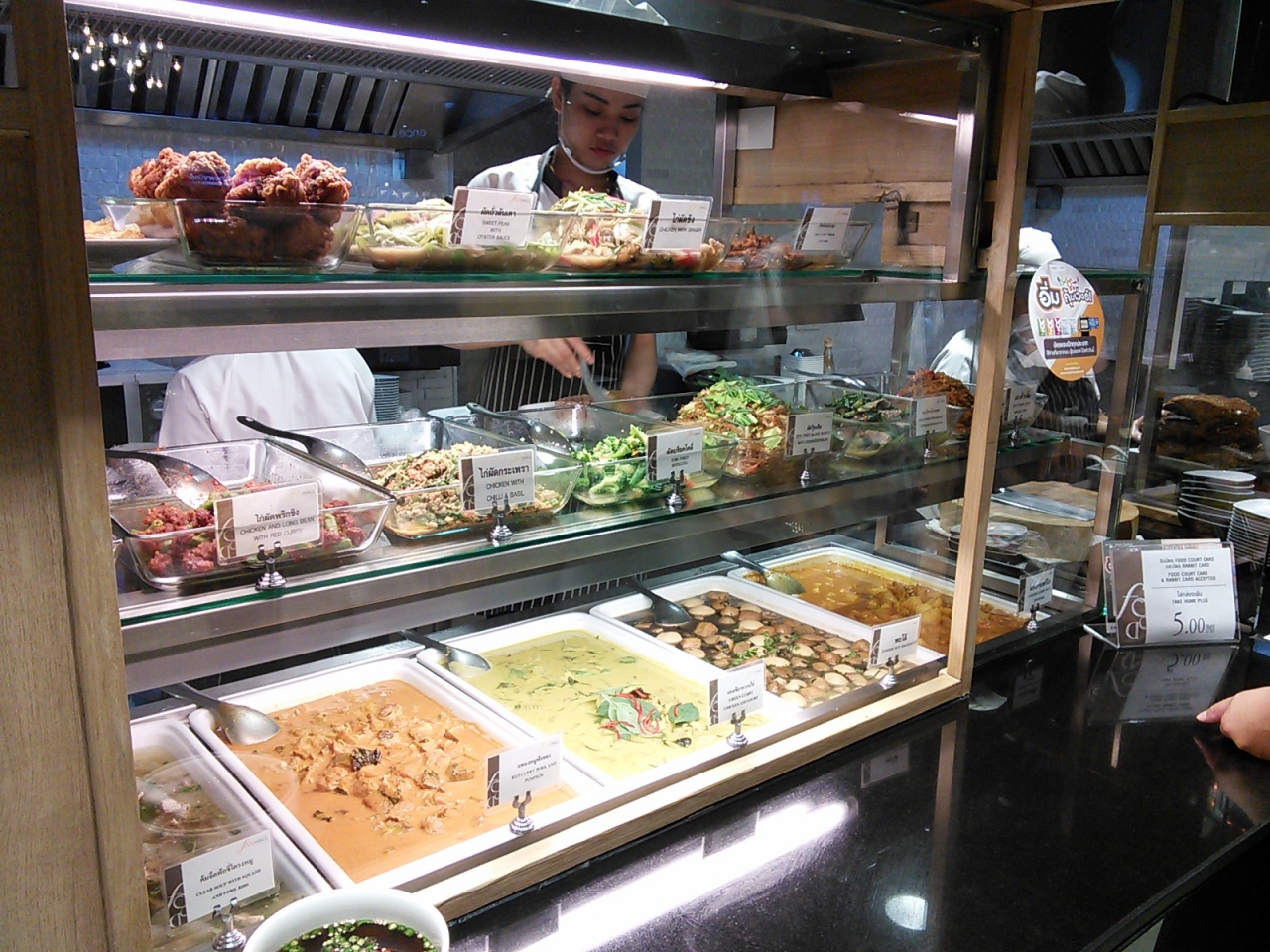 スクンビット通りのアソーク交差点近くにある「terminal21」というデパートの5Fにあるフードコートです。ここはバンコクの人気レストランが出店しているようで、それにもかかわらず他のデパートのフードコートに比べると値段が安い!どれも安いのですが特に安いのがカオ・ラート・ゲーン(いわゆる“ぶっかけ飯”)。青地に白文字の楕円形の看板の「マンサウィラット」(タイ文字で書かれています)はおかず1種類乗せて25B、2種類で30B。+5Bでご飯が大盛り(2倍)になります。ただこの店はベジオンリー、けど味はおいしいです。その辺の路上の屋台より安いなんてありえません。超おすすめです。