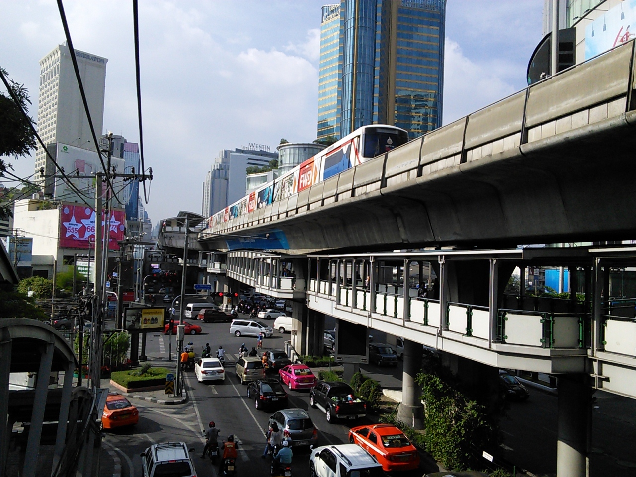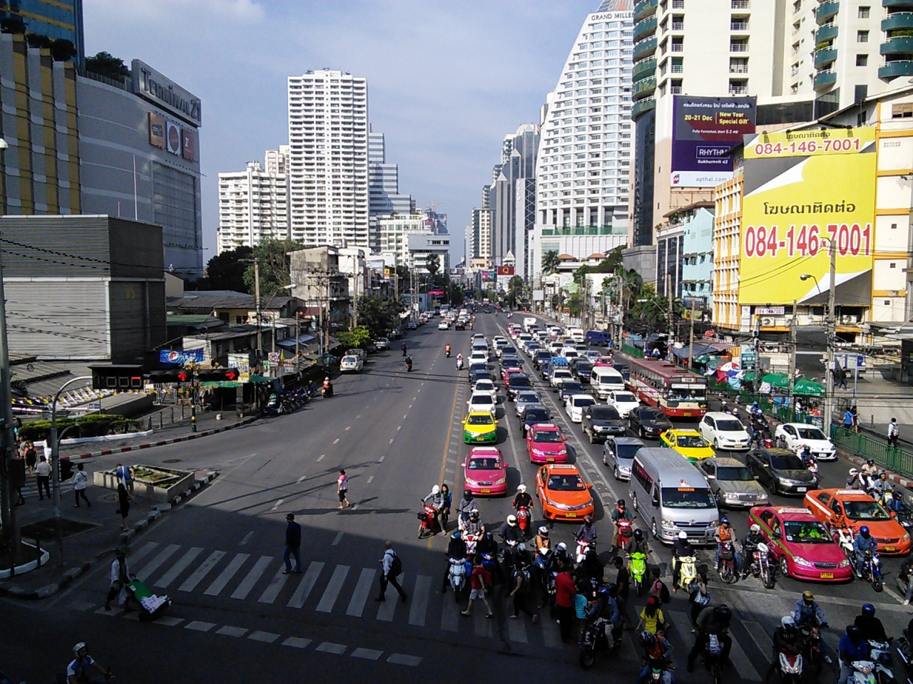 ほぼ全線にに渡って通りの上をBTS(高架鉄道)が走っており中央分離帯が設けられています。交差点が少ないのでとにかく道路の反対側に渡るのに苦労します。BTSの駅を通り階段を登って下るのも結構めんどくさいものです。車の少ないときに中央分離帯をくぐって渡ってしまおうなどと考える人は少ないと思いますが、この行為ははっきりと禁止されています。「JayWalker(交通規則を無視して道路を横断する歩行者)200B」という看板が掲げられています。もちろん警官に見つかればということですが…。それよりも危険なのでやめた方がいいです。