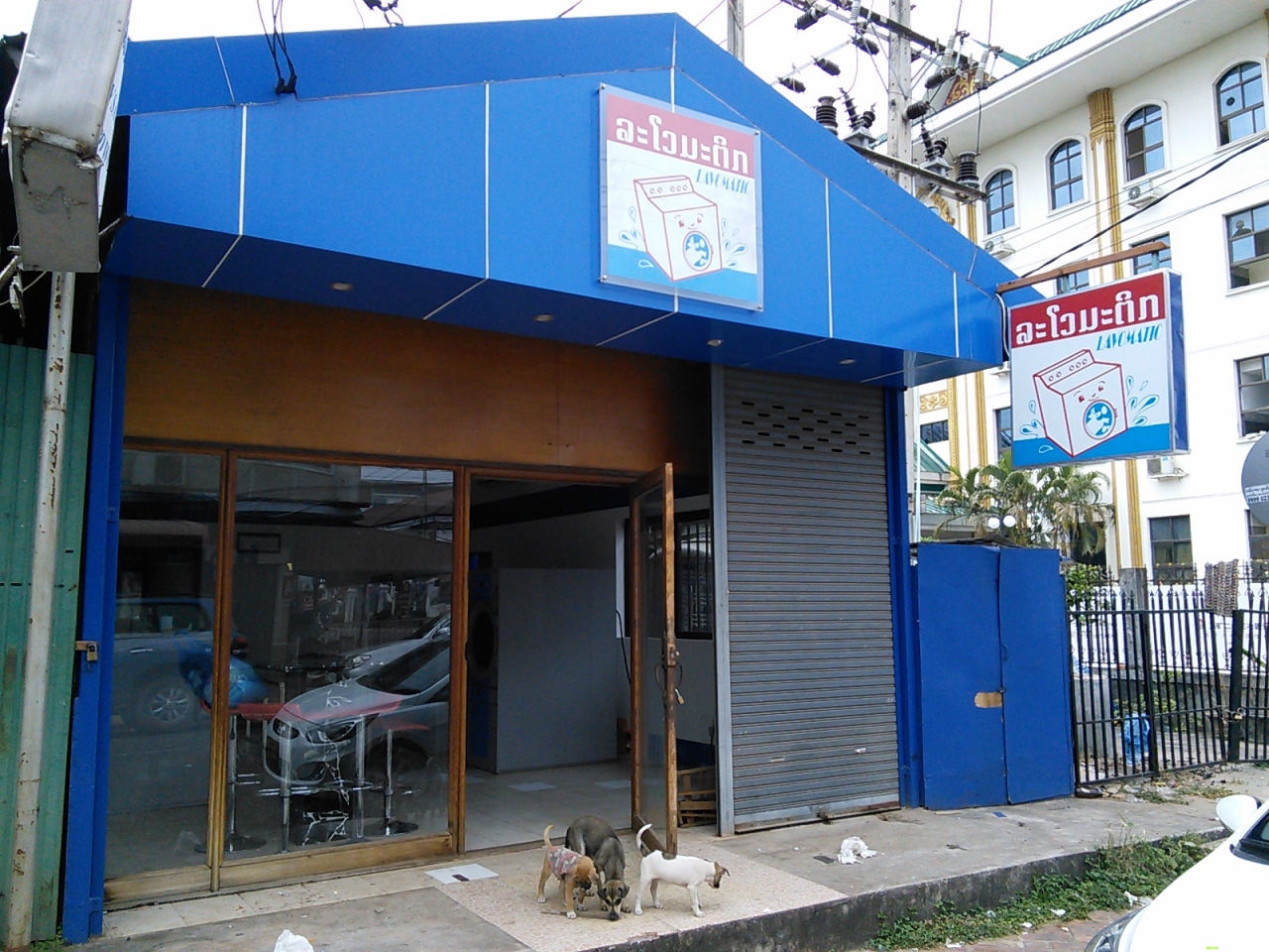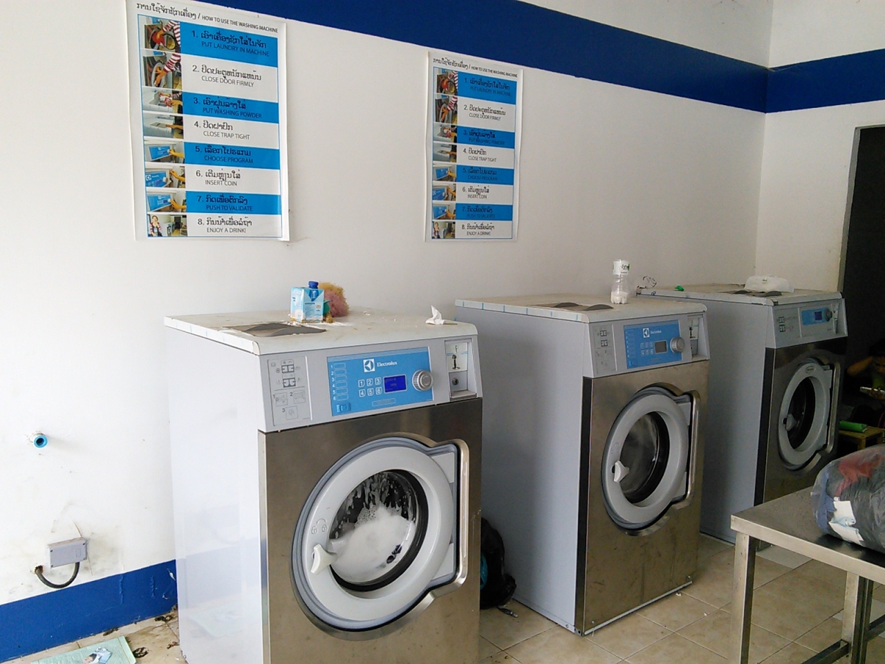 有人のコインランドリーです。正確にはお金を入れて動かすのではなく終了後に店の人に料金を支払います。店内はなぜかゴミだらけで荒れ果てています。あまりやる気がないみたいです。ドラム式の洗濯機(10kg用)が3台、乾燥機が3台置かれていて料金は洗濯機25000kip、乾燥機25000kip。洗剤は5000kipで販売しています。