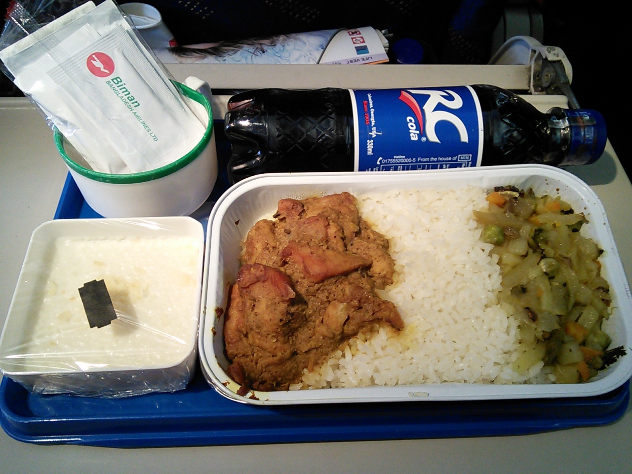 ダッカでの待ち時間が16h5mでしたがカトマンズで預けた荷物はバンコクまで行くとのこと。したがってバングラデシュには入国せずにトランジットエリアで一晩過ごしました。もちろんホテルは付いていませんでしたが夕食、朝食が付いていて空港内のレストランで無料で食事ができました。