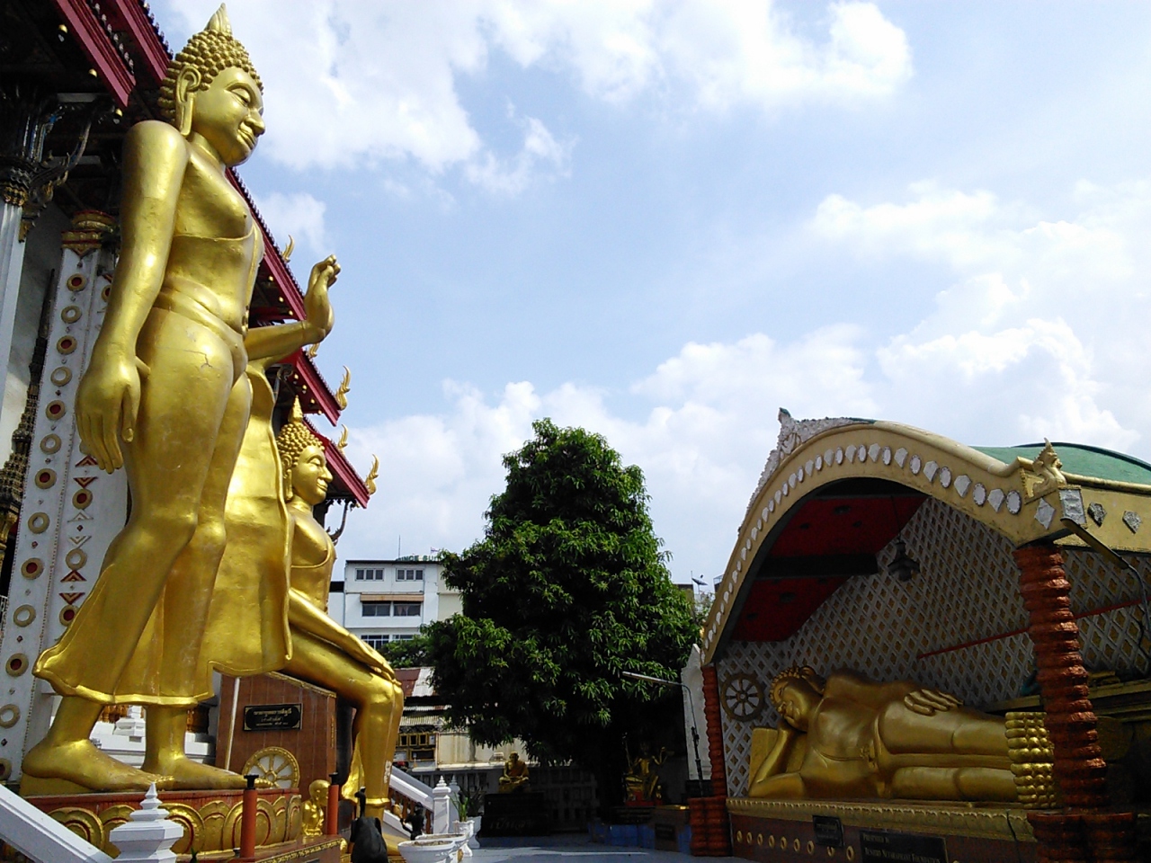 表の通りからは想像できない寺院です。まず正面入口を入ると古びた本堂が二棟あり、これだけかなと思いつつ奥へ進むと大きな真新しい本堂があります。それよりも驚かされたのは巨大な金ピカの仏像が4体あること。その様はなかなか圧巻です。仏像を眺めつつ本堂を一周し入口付近で休んでいたら男性がやってきて「この寺院は入場料200Bが必要です」と。ただ言われただけで請求はされませんでしたが…。チケットカウンターはもちろん注意書きなどもなくそのような雰囲気はまったく感じられませんでした。200Bを払ってまで入るところではないかなと思います。