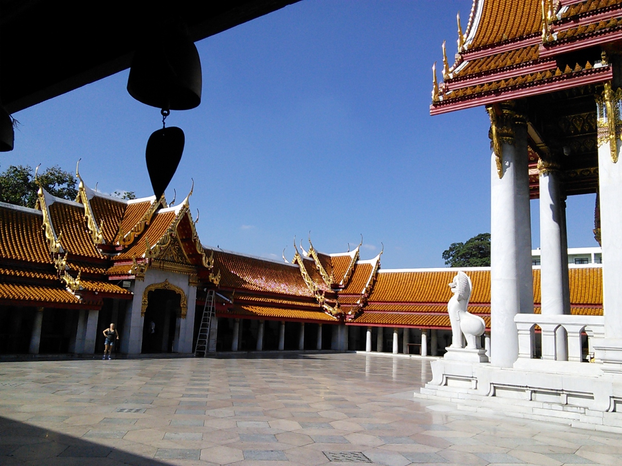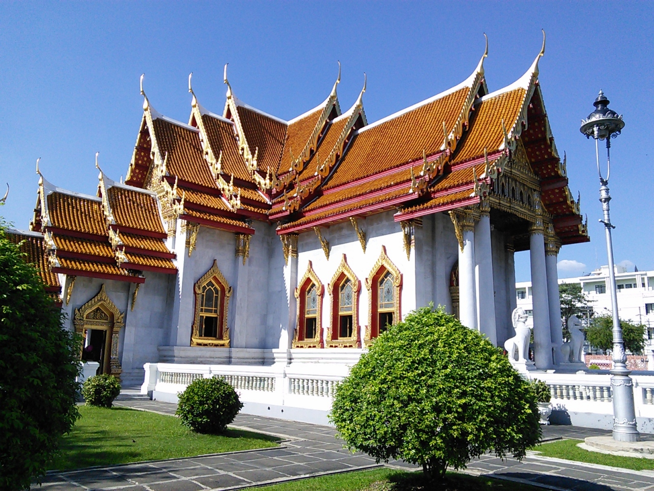 白亜の寺院。壁や柱が大理石で作られているため陽の光を受けて輝いていました。屋根の瓦がまた鮮やかなオレンジ色で寺院の様は美しいの一言です。本堂の正面入口では20Bのチケットの有無を確かめられますが横や裏にも出入口がありそこからだとチケットなしでも普通に入れます。本堂を取り巻く回廊にはタイ国内、世界各地の様式の仏像が並べられていますがレプリカなので今一つ迫力が感じられません。寺院の庭も広くとてもきれいに整備されて芝生も植えられています。運河を模した池もあり、とにかくこの寺院は美しいです。